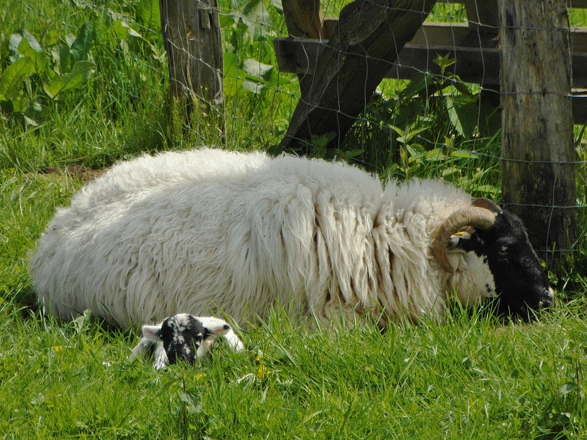 Eine Herde Schafe ist auf den Wiesen und ein kleines Lamm hat es sich neben der Mutter bequem gemacht.