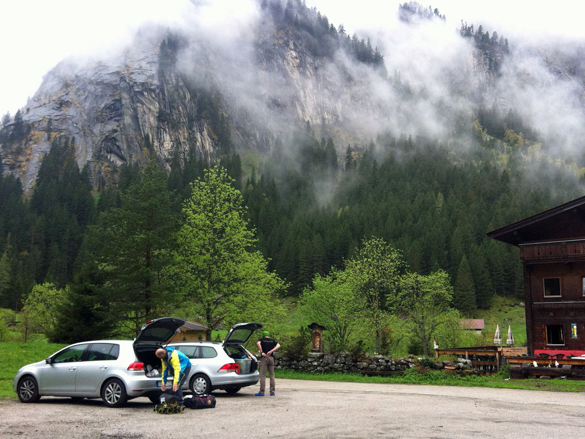 Uli wurde in Markt Schwaben bei München unterwegs noch eingeladen, kurz vor der Grenze, die Alpen in Sichtweite, noch die Vignette besorgt und mit vollbepacktem Auto kamen wir bei herrlichstem Wetter gegen 16:30 Uhr im Alpengasthof in der Au an, welches auf 1.267hm liegt. Auf der Wiese stand der Bergfreunde-Leih-LKW und die ersten Bergfreunde und Blogger wurden begrüßt.