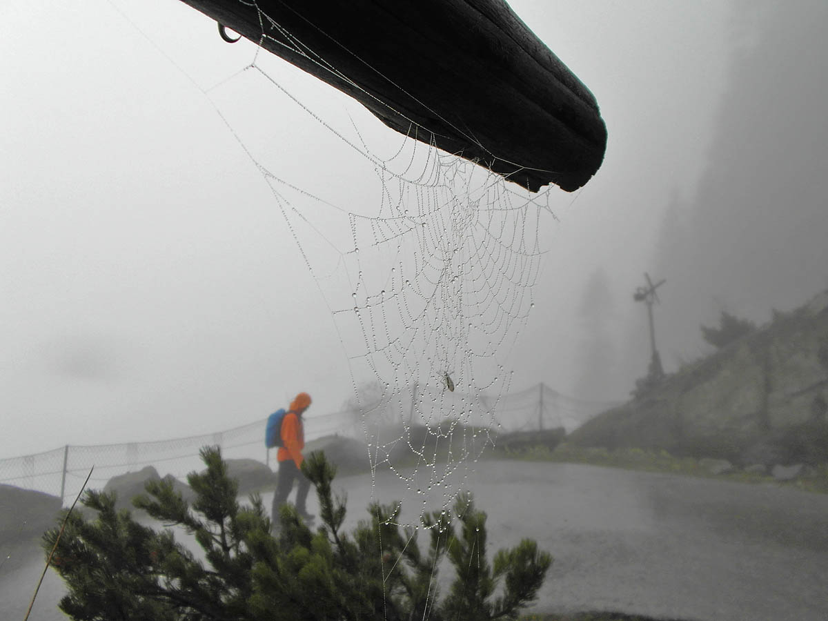 Regen an SpinnennetzVorbei an dem Alpengasthaus Adlerblick waren wir dann doch zu weit oberhalb und gingen wieder zurück.