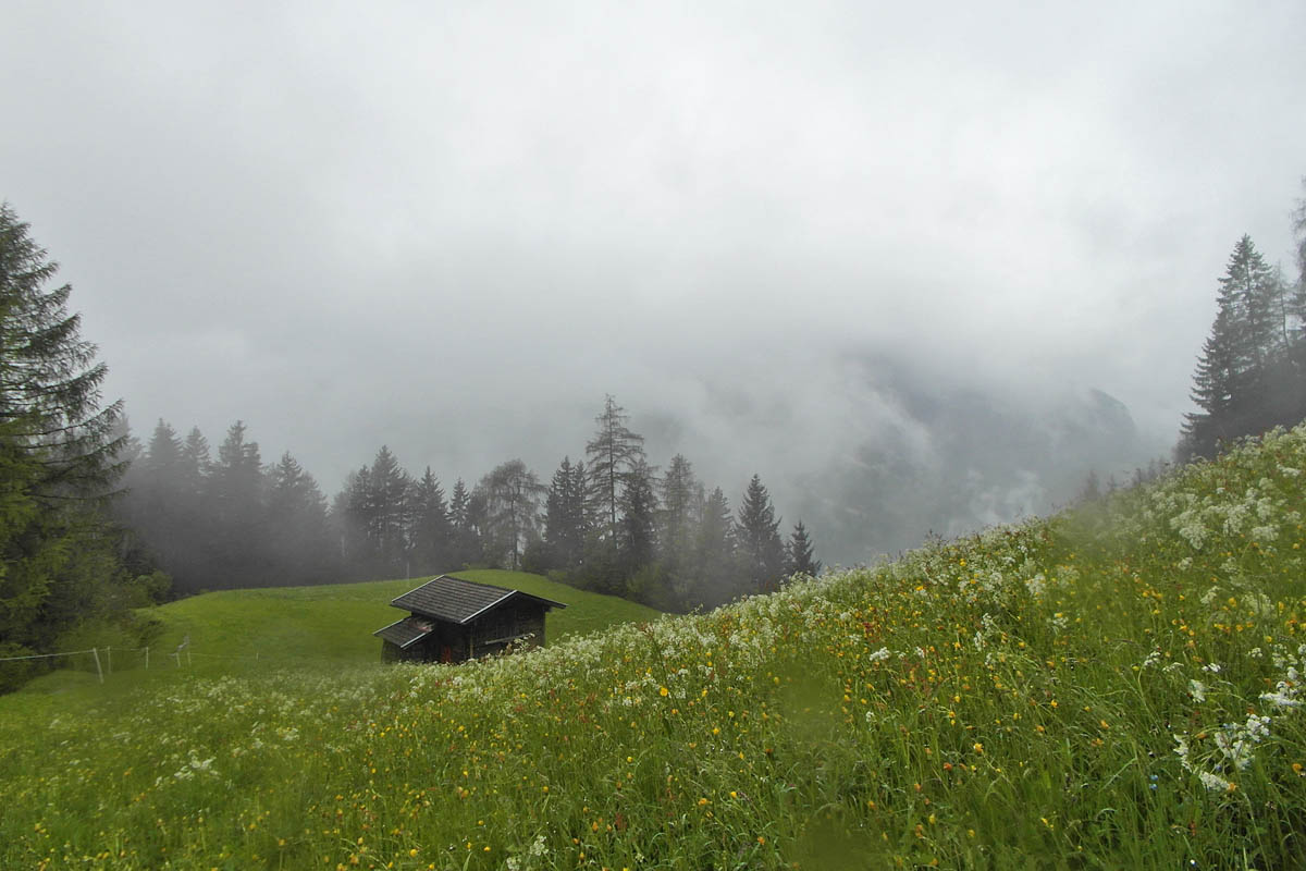 Trotz des Regens wurde mir langsam wieder wärmer und irgendwann tauchte auch Steve wieder auf, berichtete von Schnee kurz unterhalb der Plauener Hütte und flog quasi an uns vorbei. Ein kurzes „Setz schon mal den Kaffee auf“ wurde ihm noch hinterhergerufen und schon entschwand er auf dem Pfad hinab.