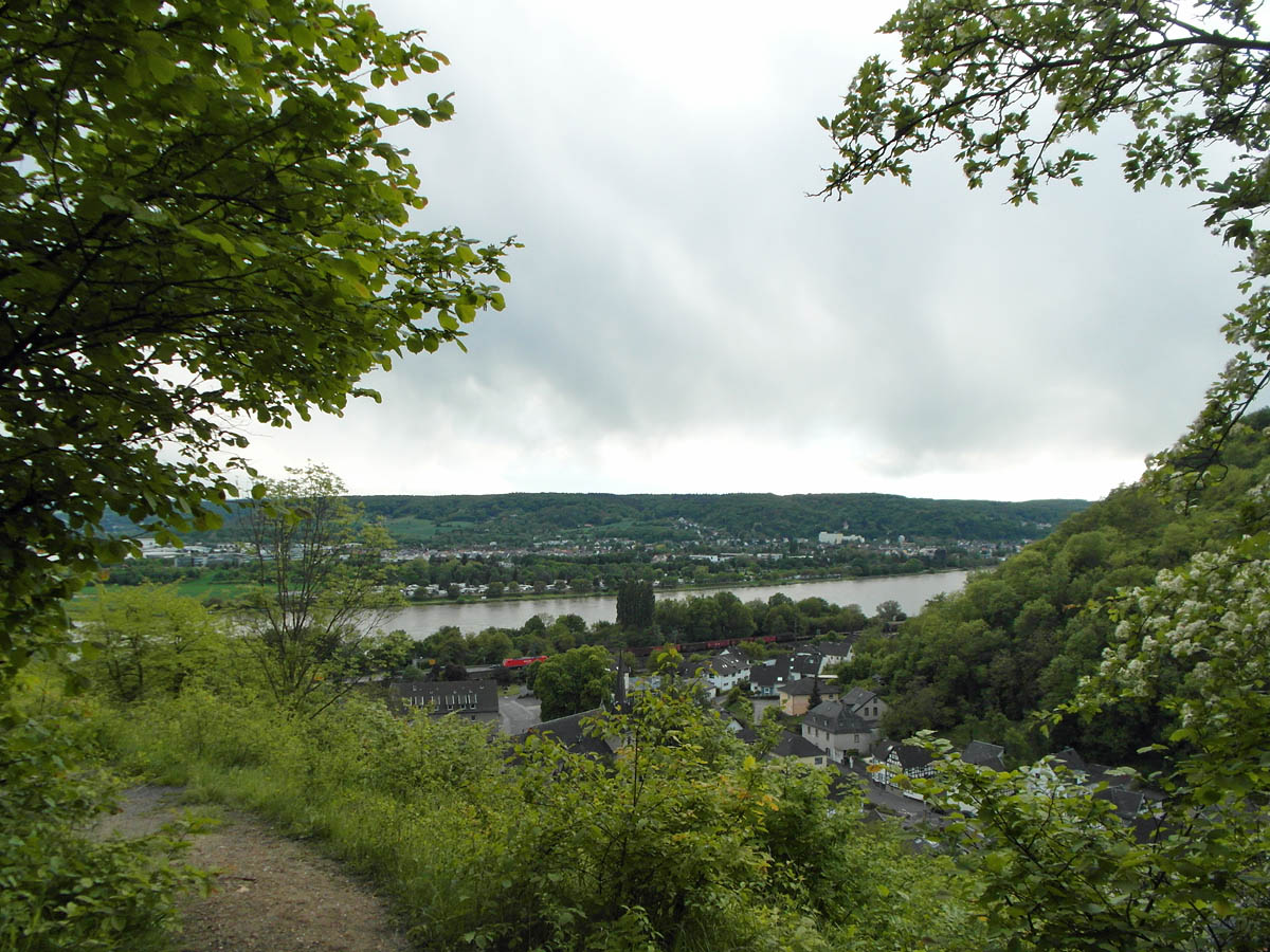Dieser bietet einen Blick auf Kasbach und Remagen auf der gegenüberliegenden Rheinseite. Der Pfad hinab ist bei der Witterung wirklich rutschig, also muss ich aufpassen und komme noch unmittelbar an den Schienen vorbei um später unterhalb des Viadukts der Bahn kurz danach wieder zum Startpunkt zu gelangen.