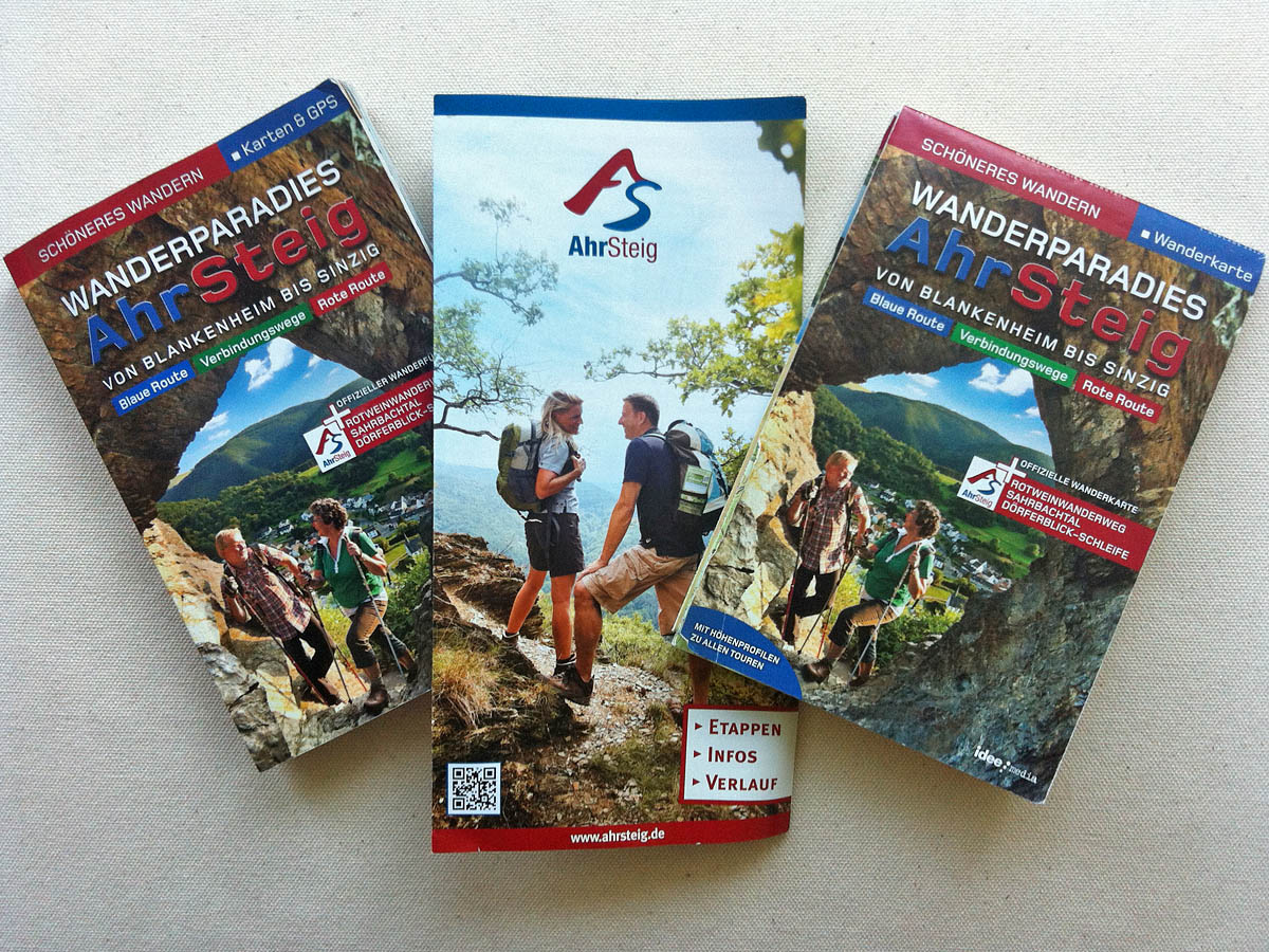 Ach so… *räusper* ein bisschen stolz binWanderbuch, Flyer und Karte ich natürlich, als eine Kollegin mir letzte Woche den Flyer vom Ahrsteig mitgebracht hat. Es gibt zwar auch Bilder im Wanderführer und auf der Webseite, aber so als Titelbild… das hat schon was 😳