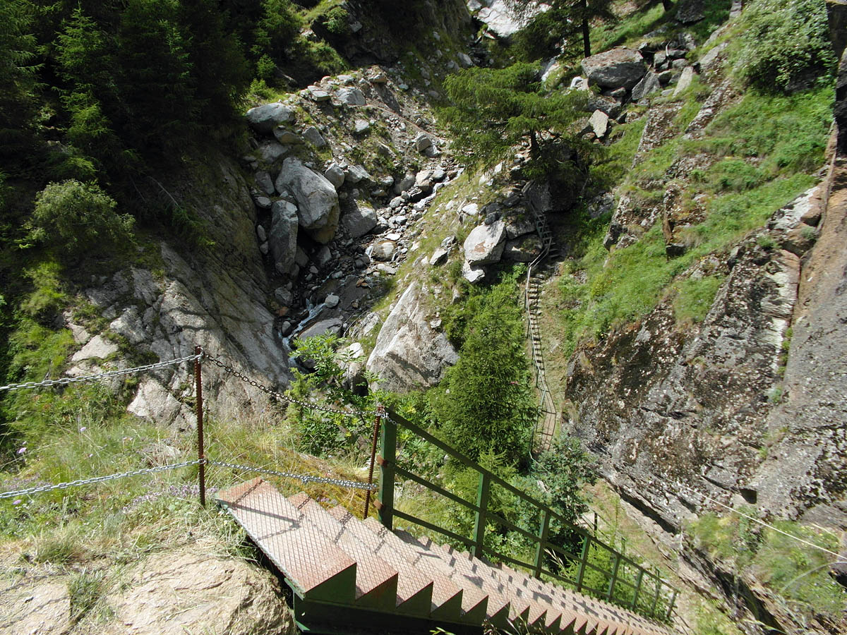 Später führte der Weg über dicke Steine durch den Wald und ich hörte in der Ferne ein Gewitter aufziehen. Eine Hängebrücke musste überwunden werden (nach der Brücke in Vent war das auch nicht mehr so schwer) und nach weiteren Felspassagen erreichte ich gegen 16:00 Uhr das Hochganghaus.