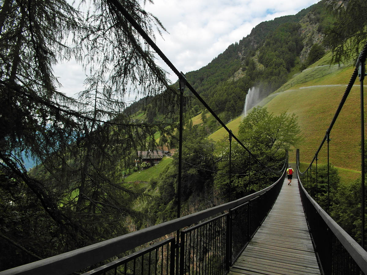Abermals ging es um 8 Uhr los. Auf den Almwiesen, die frisch abgemäht waren drehten sich in den Morgenstunden die Sprinkleranlagen. Da hier im Vinschgau so herrlich mildes und sonniges Klima herrscht, ist es mit Regen relativ mau. So gab es früher sogenannte Waale (Bewässerungsgräben), welche WasserJump & Run auf der Hängebrücke über Kanäle zu den Landwirtschaftlichen Nutzflächen geleitet haben. Einige davon gibt es noch heute und dort führen sogar Wanderwege entlang (Waalwege).