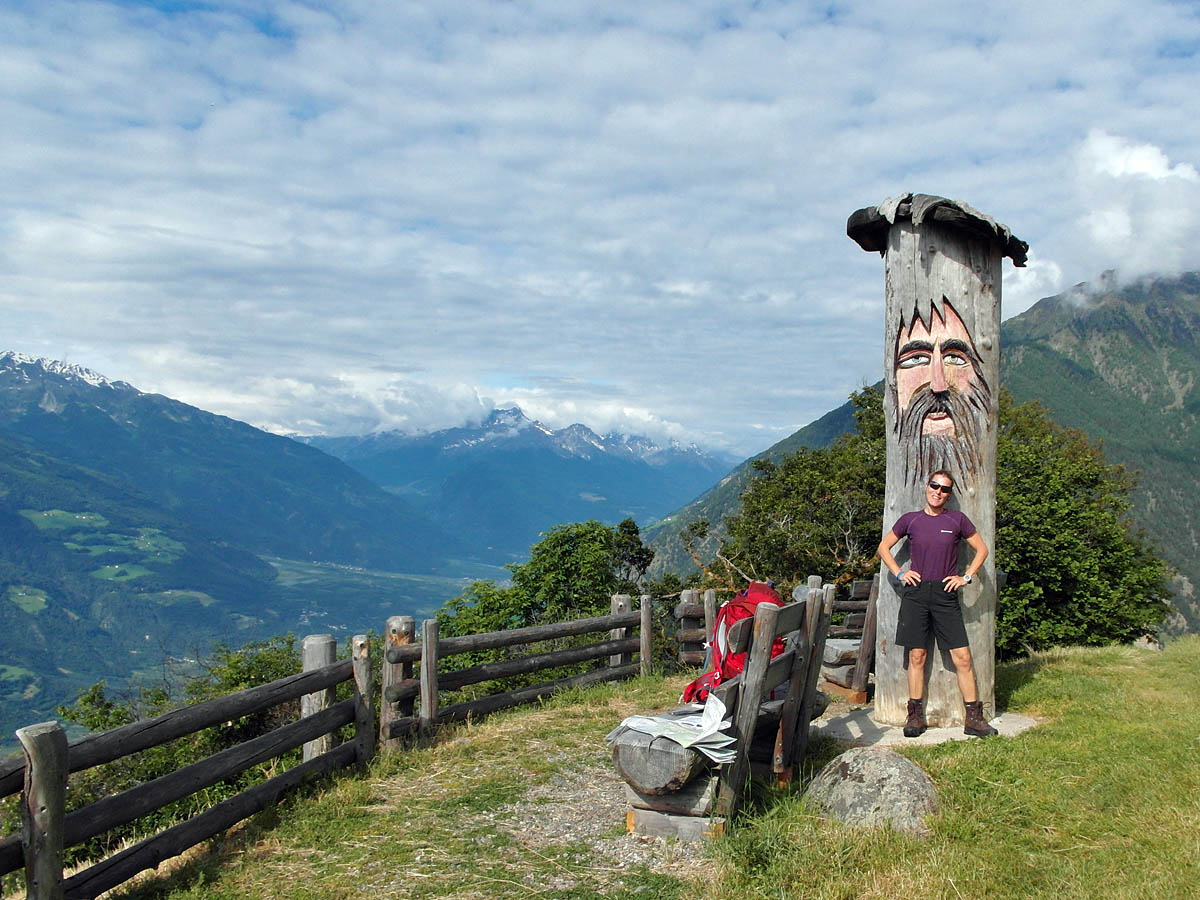 Über Hangpfade führt der Weg nach Lint. Rast mit Holzmann in der SonneVorab gibt es noch einen Marterpfahl mit Blick auf Naturns.