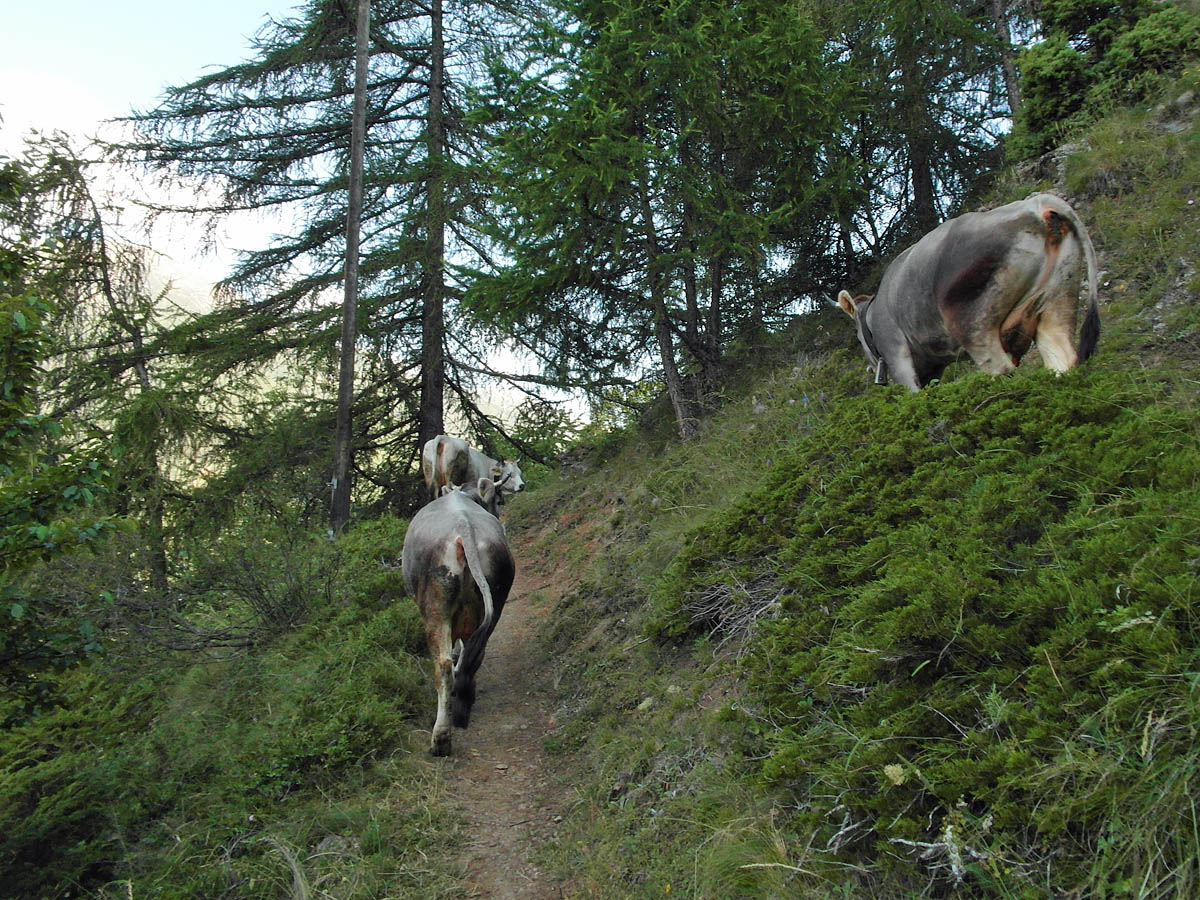 Zunächst geht es über Almwiesen auf denen der Morgentau glitzert. Immer wieder müssen auf dem Höhenweg Tore und Gatter geöffnet und geschlossen werden und im folgenden Abschnitt bringt der Bauer grade seine Kühe dort hin. Drei Kühe schleichen langsam auf dem Pfad vor mir her, andere haben sich schon ein Plätzchen links und rechts des Weges gesucht. Ich bin nicht in Eile, also lass ich auch die drei in Ruhe einen Platz zum grasen suchen und gehe weiter.