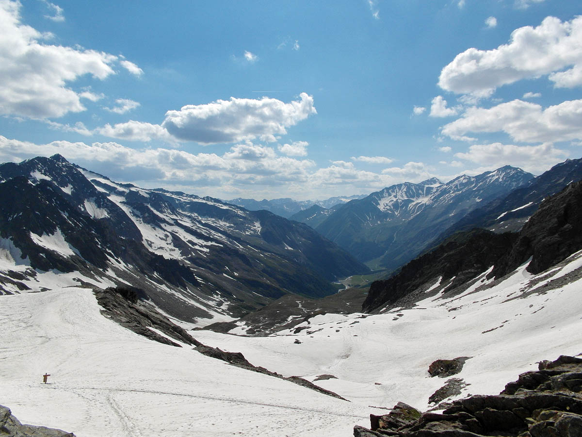 Der Schnee ist weich und je höher wir kommen, umso tiefer sinken wir ein. Die Sonne brennt hier oben zwar mächtig, da der Wind aber stärker wird, ziehe ich mir ein Langarmshirt über. Wir erkennen andere Wanderer die sich in Serpentinen bis zum Eisjöchl durch den Schnee kämpfen.