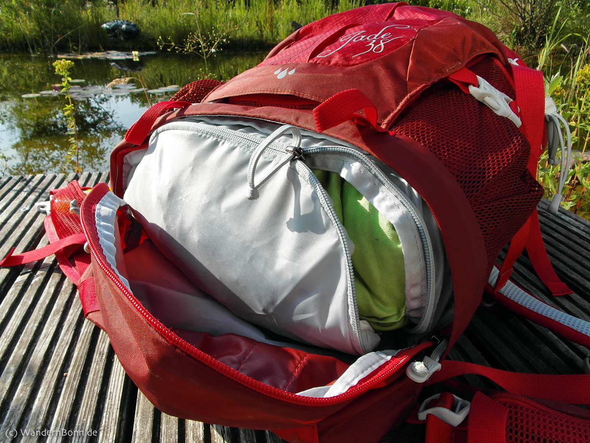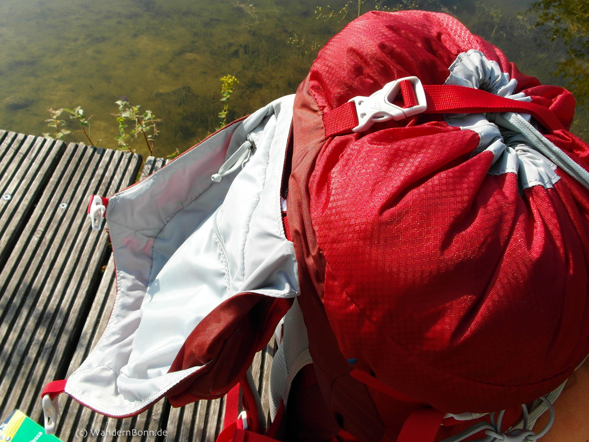 Das Deckelfach ist groß genug um auch das Langarm-Shirt oder sogar die Fleecejacke dort unterzubringen, ebenso wie Karte und Wanderführer.