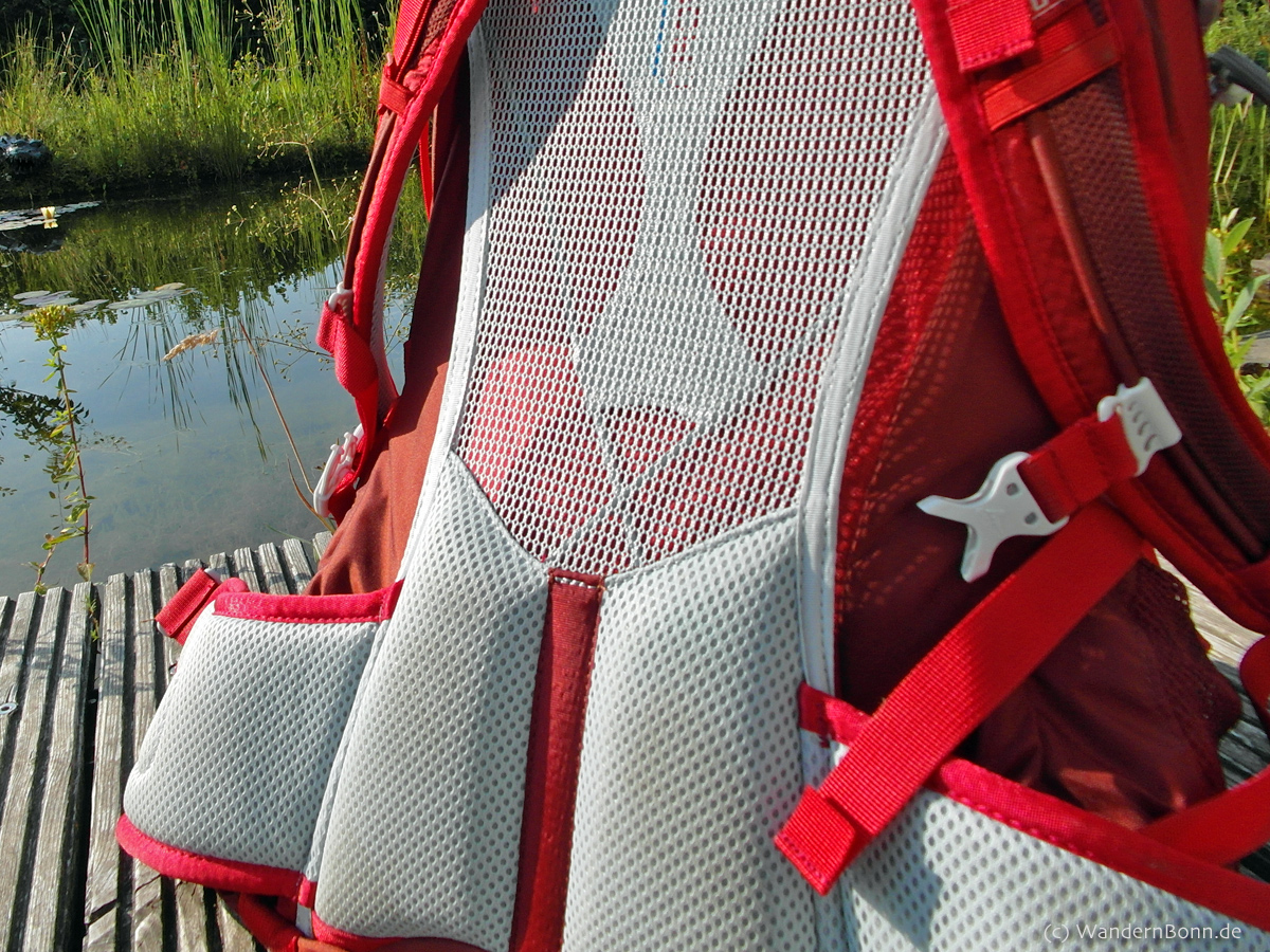 Mit 1.400gr schlägt er sich jedoch gut, da mein Deuter Tagesrucksack mit 22l fast genauso viel wiegt. Der Netzrücken ist im unteren Bereich noch ausreichend gepolstert und liegt durch die Hüftflossen gut auf.
