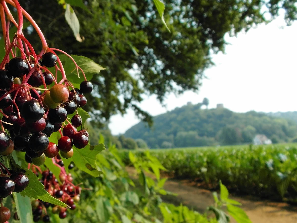 Der Holunder ist fast reif und ich in der Ferne sehe ich oberhalb die Burgruine liegen, welche ich wenig später erobern werde.