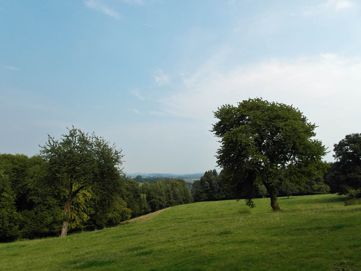 Der Wald öffnet sich und über Wiesenwege geht es weiter hinauf. (auf dem Bild unten der Blick zurück)