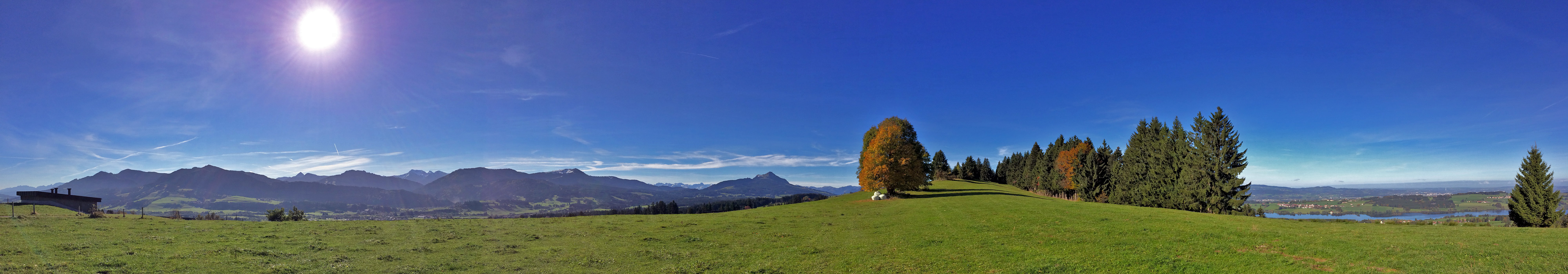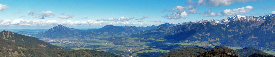Im Leben wäre ich nie drauf gekommen, da oben hin zu fahren, machte mich aber an die beschriebene Wegstrecke und siehe da: nur 5 Minuten nach dem Parkplatz erreichte ich zu Fuß das Gipfelkreuz, welches auf einem langgezogenen Hügel liegt. Dieser bot mir ein 360° Panorama: auf der einen Seite den Blick auf den Rottachspeicher und in Süd-Östliche Richtung präsentierte sich die komplette Gipfelkette vom Alpspitz bis zum Grünten. (klicken für eine große Ansicht in 4.000 x 700 Pixel)