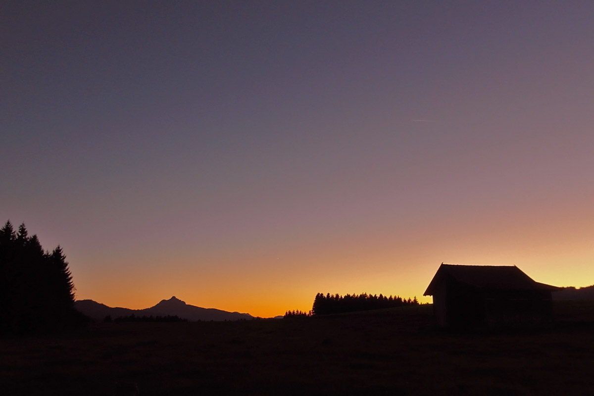 Der letzte Teil führt an weiteren HüttenHerrliche Stimmung vorbei, ein Stück durch den Wald über eine Holzbrücke und wir kürzen über eine Wiese bis zum Parkplatz ab um nach etwas über 3 Stunden Gehzeit wieder ans Auto zu gelangen.