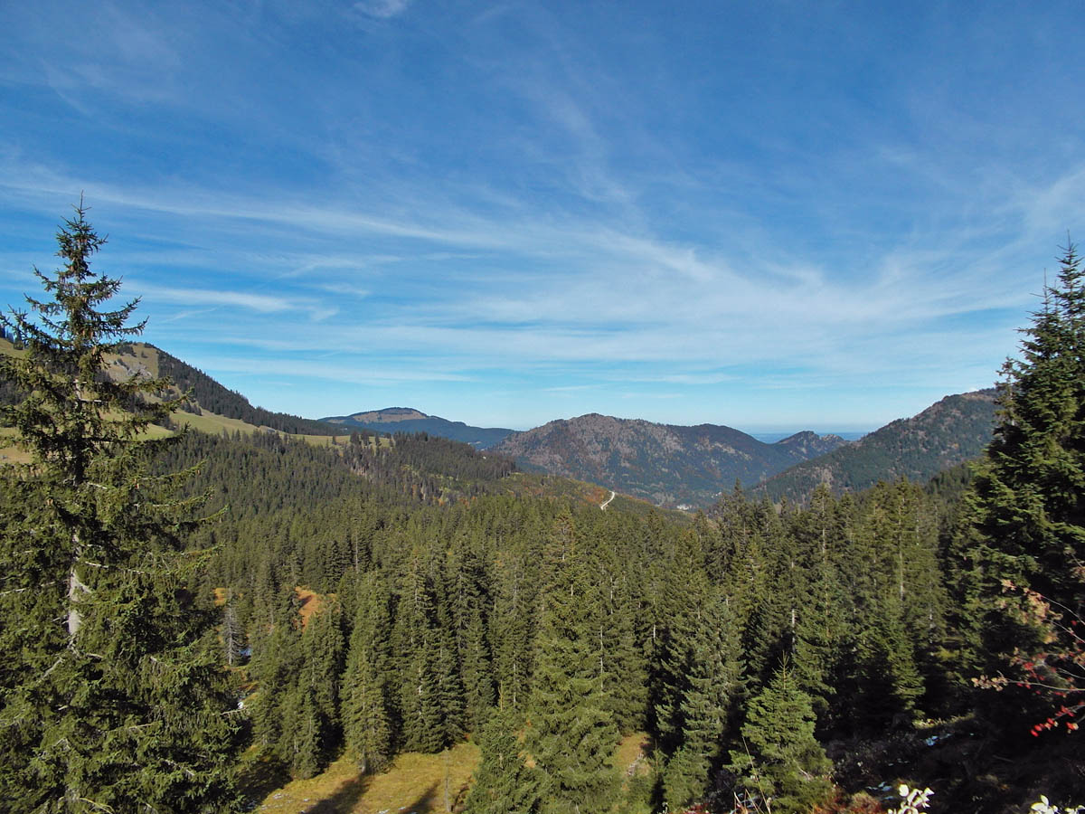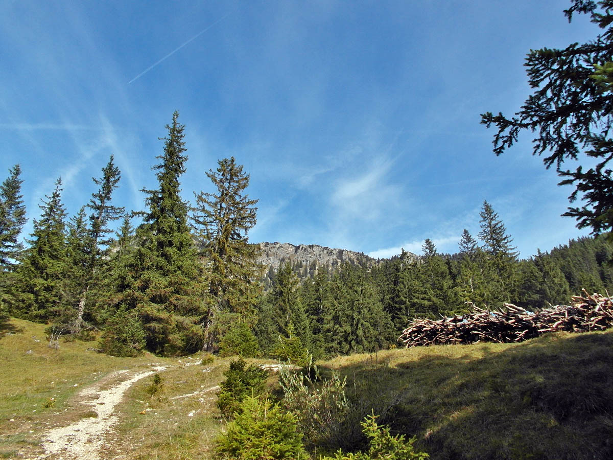 Kurz vor Untergeschwend führt der WegEin Pfad? Dann nehm ich eben den ;-) durch den Wald in einigen Kehren hinauf um dann durch offene und sonnendurchflutete Landschaft mit Bergblicken weiter in Richtung Osten geleitet zu werden.