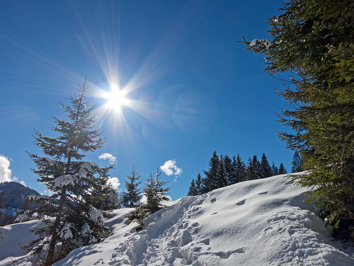 Doch neben der Spur kann ich problemlos im Schnee rumstapfen und folge dem Weg parallel durch die sonnigen Abschnitte.