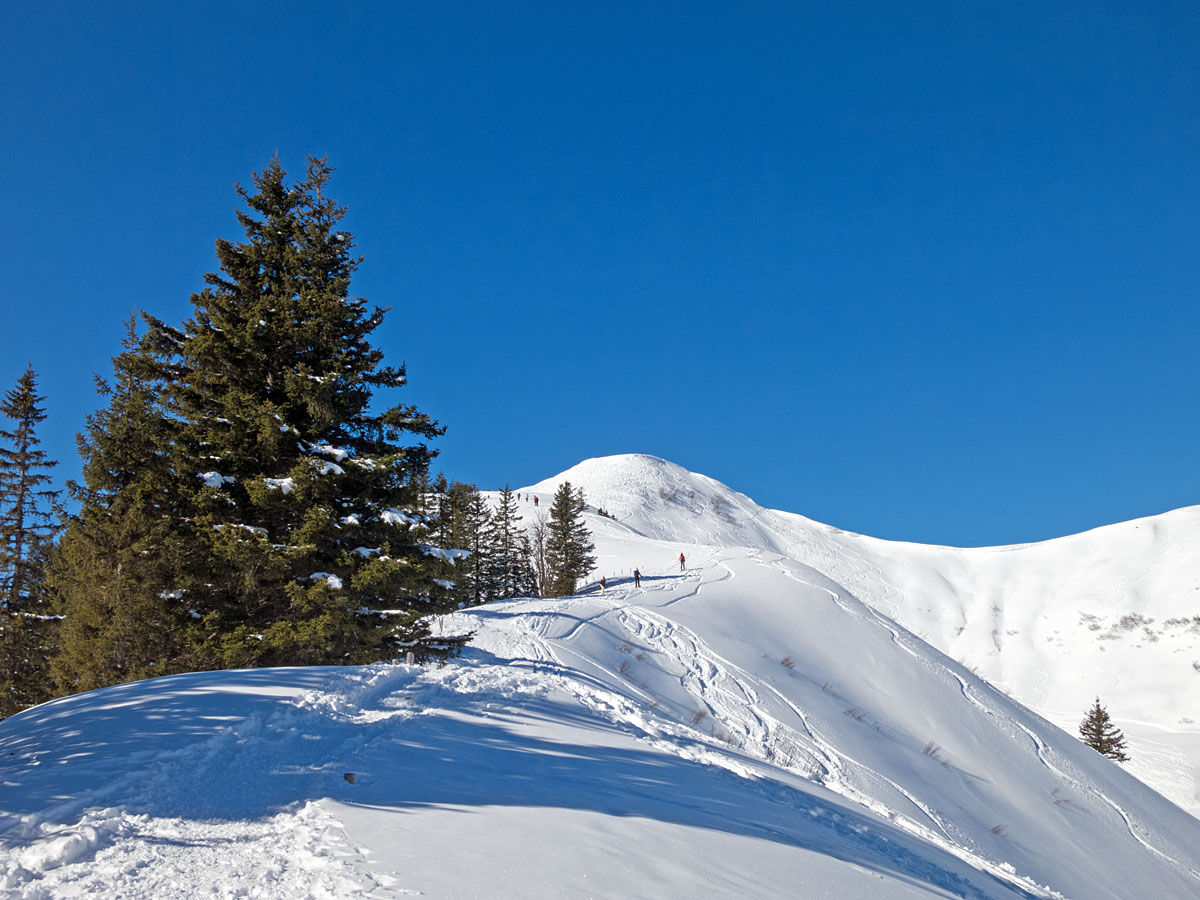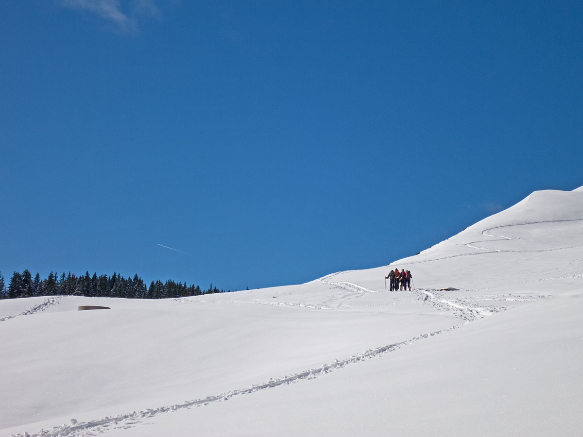 Hier sind fast nur noch Skitourengeher unterwegs und im Schnee erkennt man die geschwungenen Linien ihrer Abfahrten.