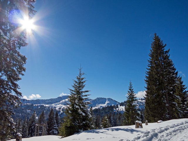 An diesem Sonntag strahlte der Himmel in seinem schönsten Blau. Die Wirtin meiner Ferienwohnung, selbst aktive Skitourengeherin, war mit der Wahl meiner Tour zufrieden. Ja, dort liege noch genug Schnee für eine Schneeschuhtour und Spuren würde es auch geben, Lawinengefahr bestehe dort ebenfalls nicht. Perfekte Bedingungen für den Einstieg.