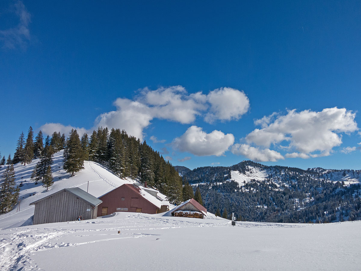 Eine halbe Stunde später stapfe ich das StückDie Höllritzer Alpe wieder hinab und komme an der Höllritzer Alpe vorbei. Auch hier haben sich Wanderer und Skitourengeher einen Platz in der Sonne gesichert. Der Weg führt mich mit Blick auf die Hörnergruppe wieder hinab ins Tal.