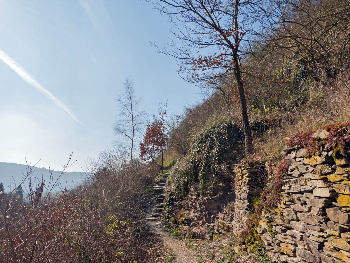 Auf dem MoselsteigNachdem dies geschafft ist, geht es auf einem Pfad mit der Markierung des Moselsteig weiter.