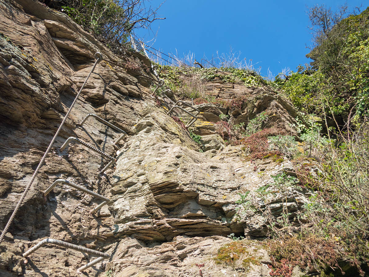 Noch vor wenigen Jahren litt ich unter Höhenangst. So ganz weg ist die zwar noch nicht, doch im Laufe der Zeit hab ich mich immer wieder an knifflige Situationen, wie seilgesicherte Felspfade, wackelige Hängebrücken oder auch Stahlleitern herangetraut. Auch Trittbügel oder Stahlstifte findet man an einigen Abschnitten an Rhein & Mosel.