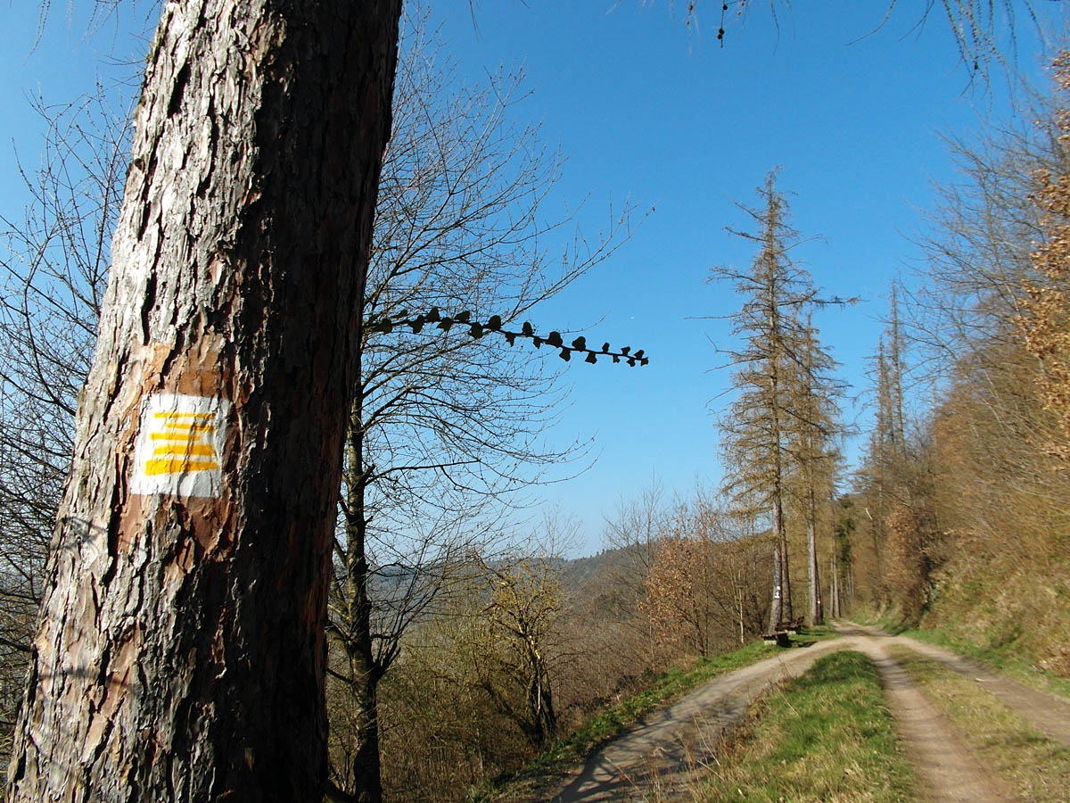 Über einen Höhenweg geht es die nächsten 2km mit schönen Moselpanoramen über einen sonnigen Weg in nördliche Richtung. Lärchen, auch mal Tannen und Buchen säumen den Weg durch die Weinberge. An einer Stelle kann ich die Löhnshöhe ausmachen, auf die ich gleich noch treffen werde.