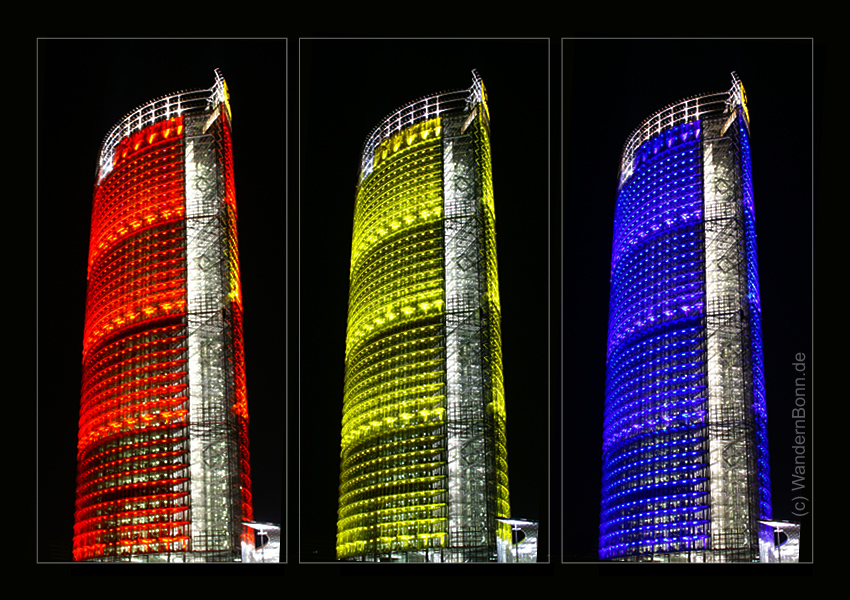 posttower-drei-farben_2005Dieses Foto ist aus dem Jahre 2005 und hat mittlerweile Seltenheitswert, da die wechselnde und bunte Beleuchtung aufgrund von Anwohnerbeschwerden kurz danach eingestellt wurde und seit einigen Jahren ein DHL Logo anstelle des Posthorns rheinseitig die Fassade schmückt.