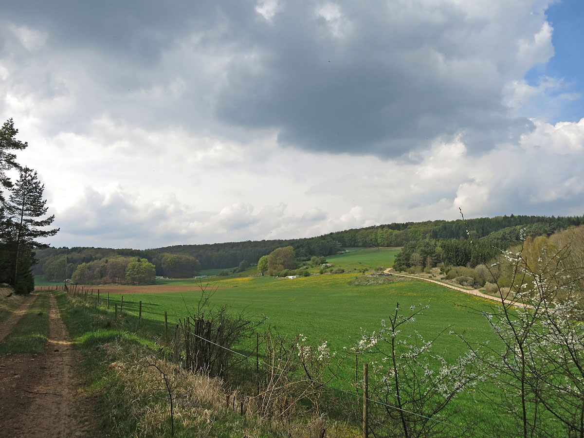 Der GPS-Track leitet mich durch den Ort, um am Ortsrand auf einen Wiesenweg abzubiegen. Die Bewohner des Hauses sind grade mit der Ostereiersuche in dem weitläufigen Garten beschäftigt und ich Grüße sie im Vorbeigehen.