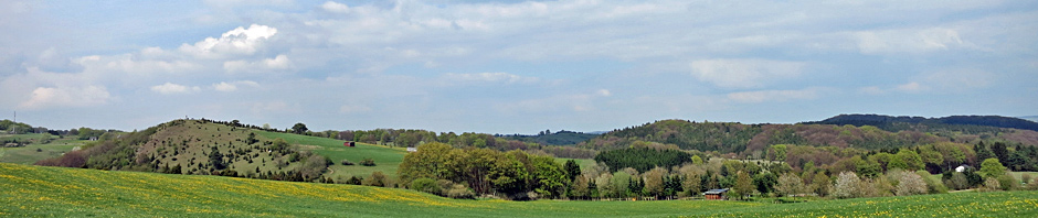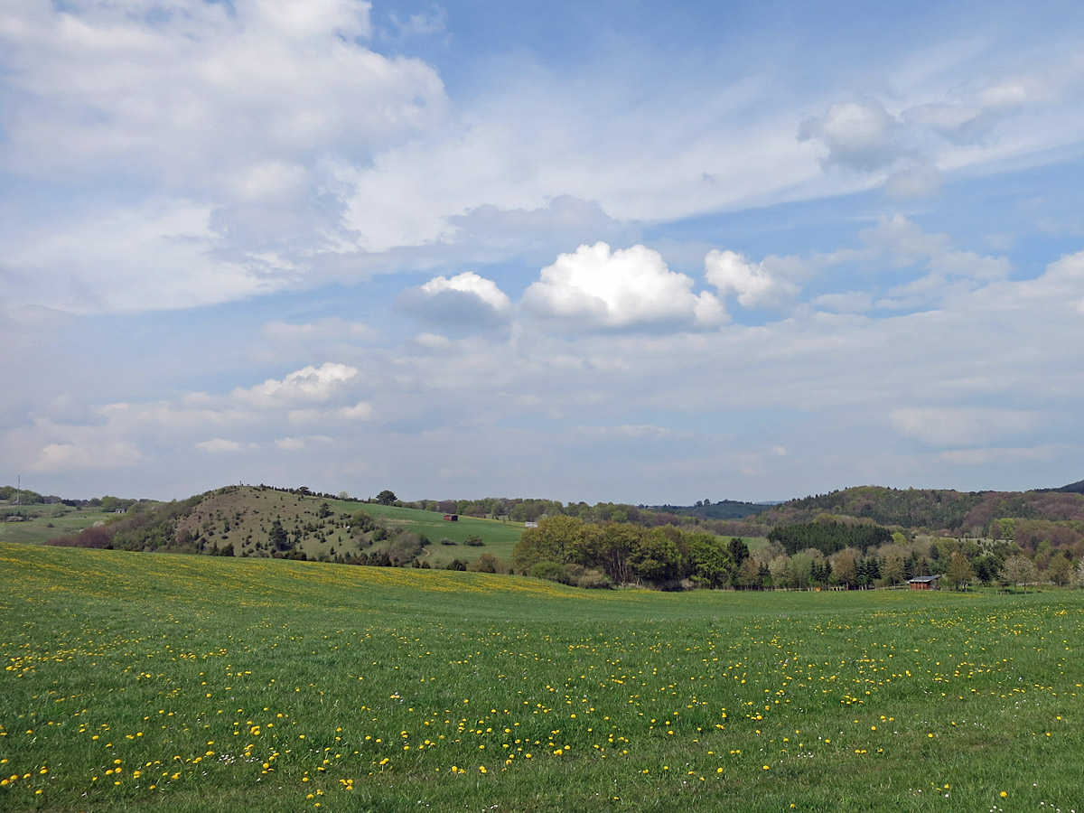 Die sanften Hügel der Landschaft mit den von Löwenzahn übersäten Wiesen und der weitere Wegeverlauf sehen aus wie ein Gemälde. Sattsehen ist also angesagt.
