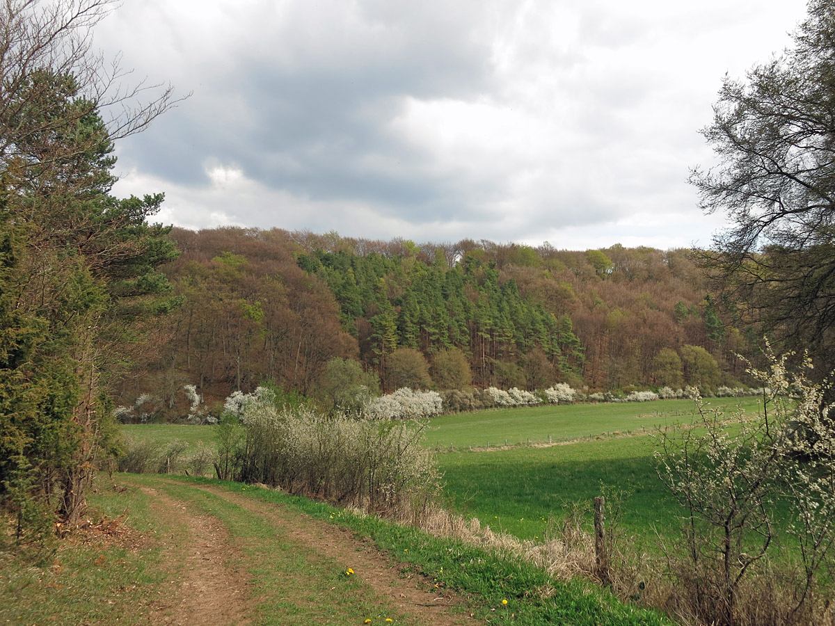 Ein weiteres Mal begleitet mich Wacholder linker Hand und ich gelange in das Tal des Wammesbachs. Auch hier setzen die weißen Blüten der Schlehen helle Tupfen in die Landschaft.