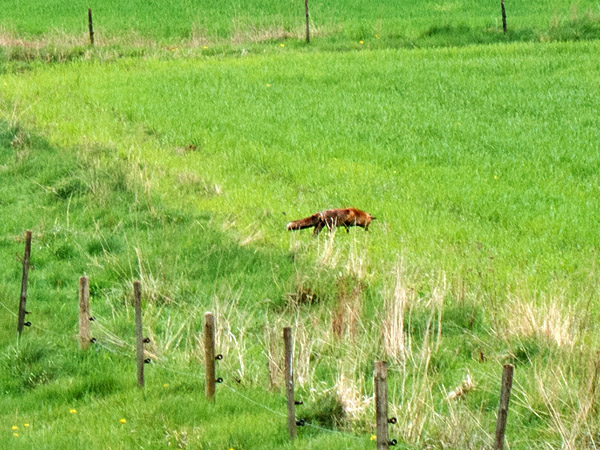 Neben dem Weg fällt mir der niedrige Elektrozaun auf, der hier gespannt ist und offensichtlich das Schwarzwild davon abhalten soll, die Felder zu plündern.