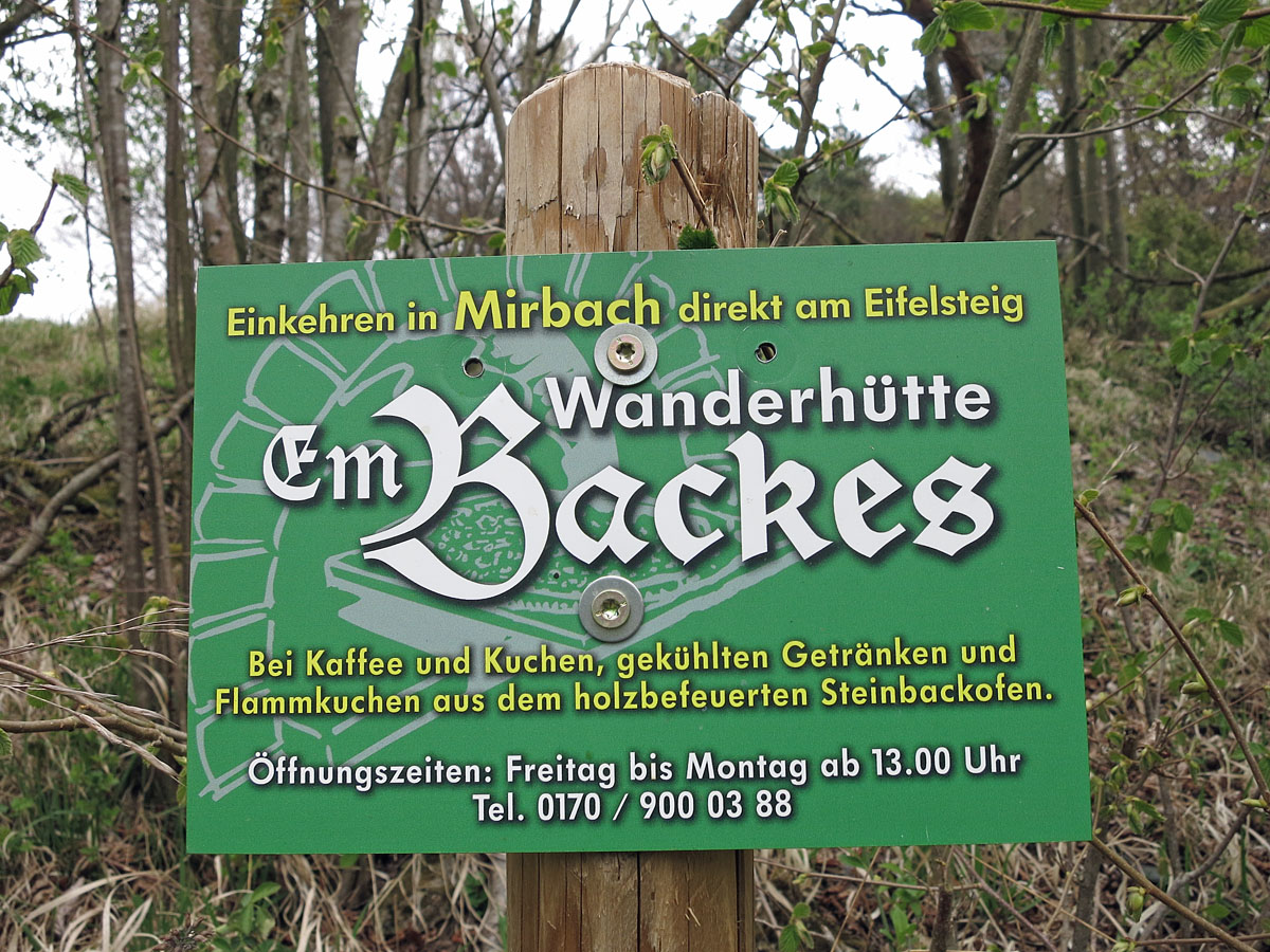 Ein paar Worte noch zur Wanderhütte „Em Bakkes“: Neben dem köstlichen Flammkuchen aus dem original französischen Steinofen, gibt es dort auch Tipps, Wanderliteratur und Kartenmaterial rund um den Eifelsteig.