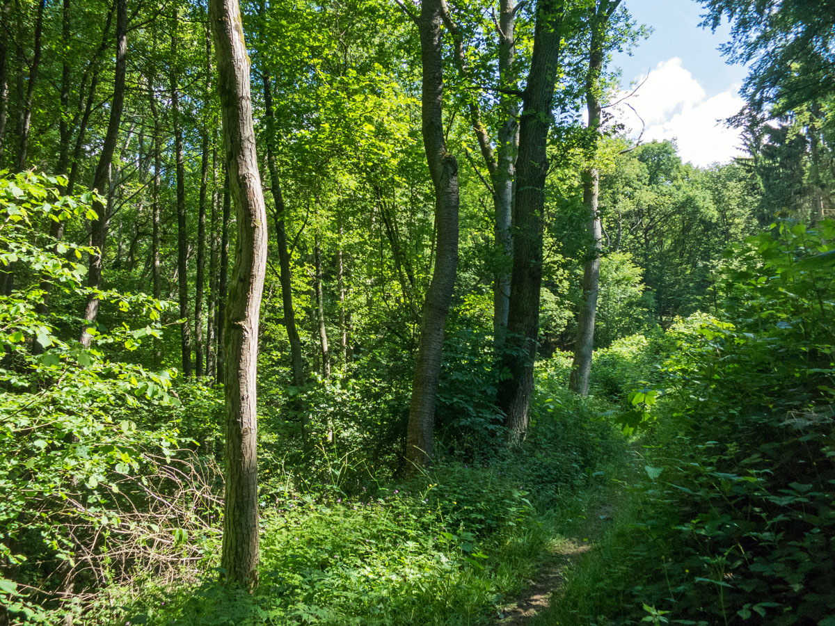 IMG_7341Für mich geht es über schnuckelige Pfade durch den Wald zunächst noch ein Stück am Bach entlang und in Kehren weiter bergauf. Vorbei an einer Wiese tauche ich wieder in das schattige Laub ein.