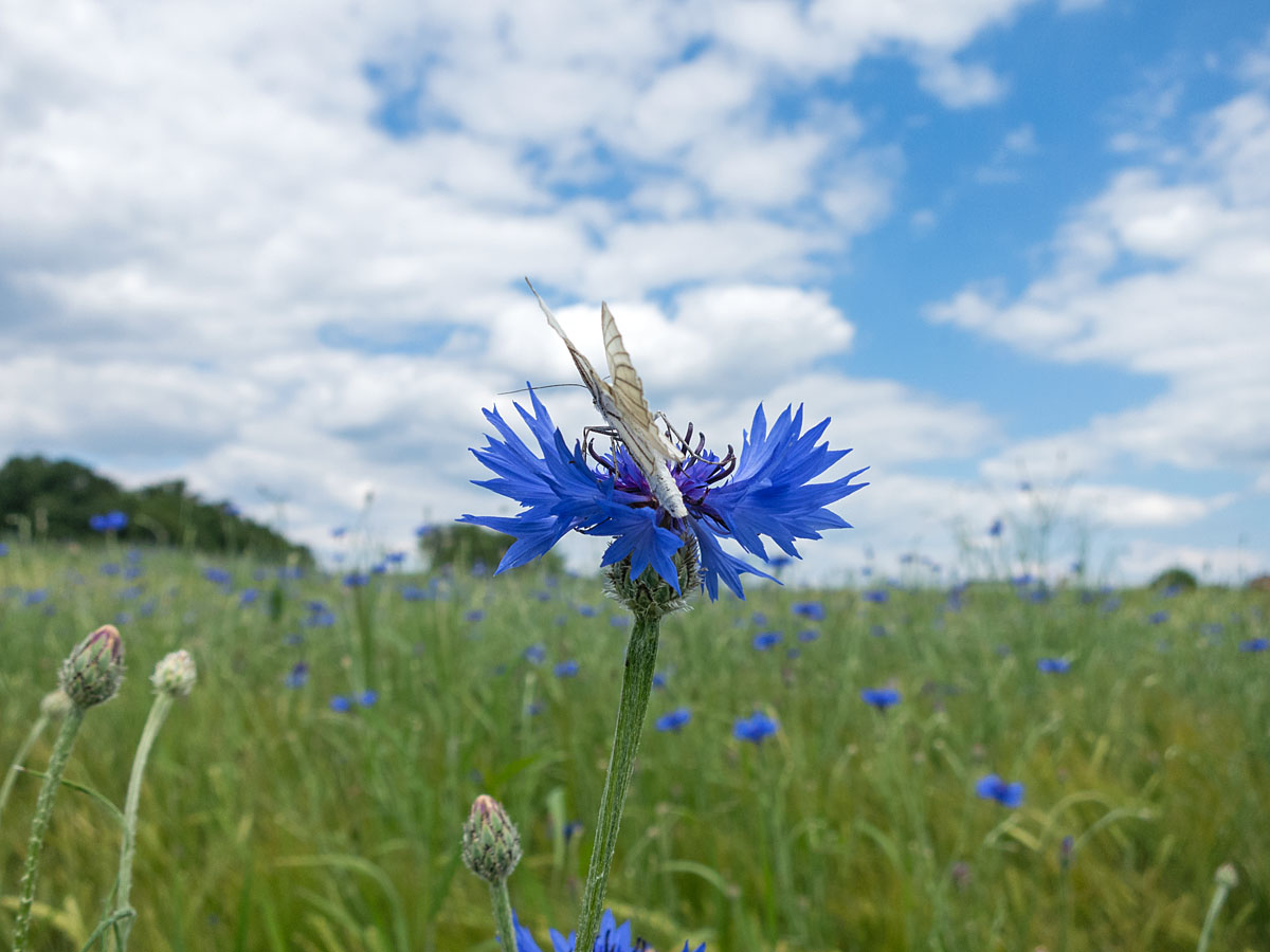 Auf weichen Wiesenwegen geht es weiterhin durch die Sonne und weitere Kornblumen wollen abgelichtet werden. Wow… so viele auf einen Haufen hab ich auch lange nicht mehr gesehen. Es gibt Zuschüsse für die Bauern, erklärt Uli, wenn diese Blühstreifen gesät werden.