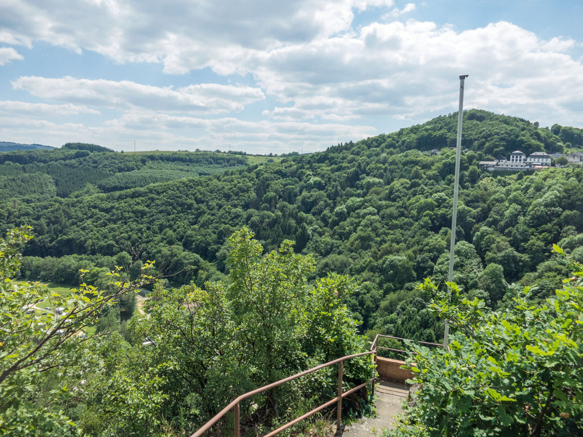 Das Simmerbachtal liegt unter uns und Schloss Dhaun gegenüber.