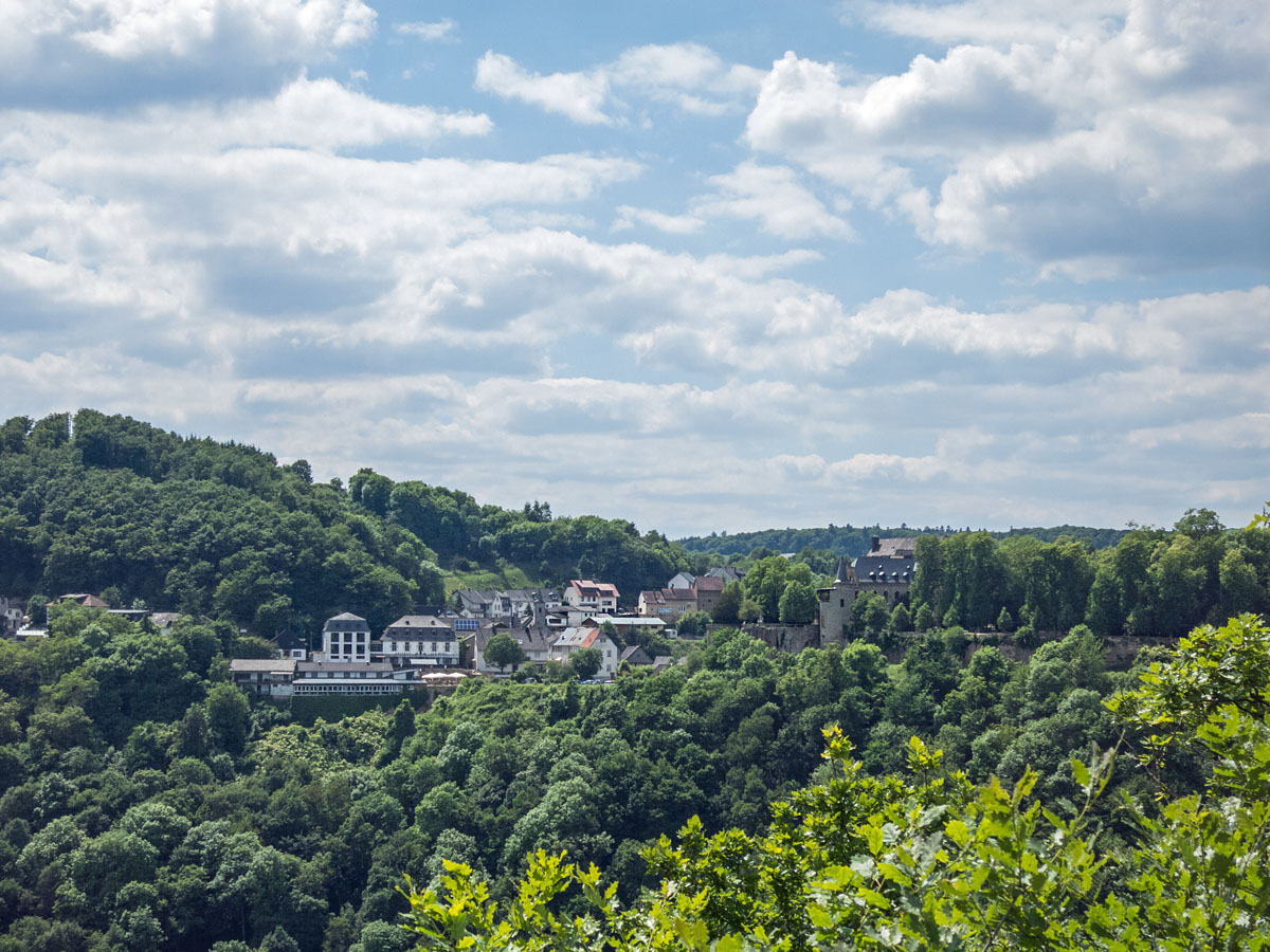 Pfadig geht es weiter bis zum Abzweig, der uns zur Uhuwarte führt. Die 200m hinab lohnen jedenfalls und bieten einen noch besseren Blick in das Tal und auf das Schloss.