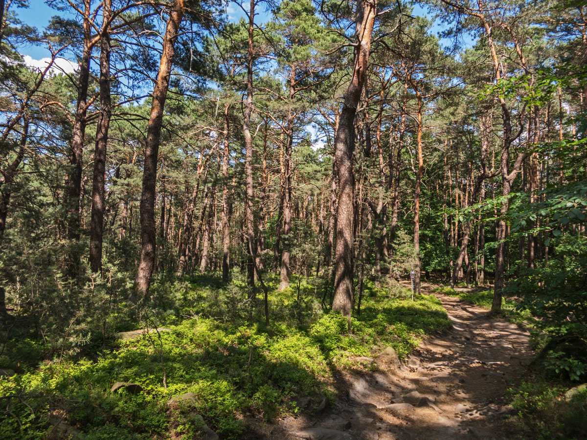 Ich folge dem Weg hinauf, biege dann aber auf einen schmalen sandigen Pfad durch Kiefern und Heidelbeersträucher ab, der mich innerhalb einer Stunde zu meinem Lieblingsplatz, hinauf auf den Nollenkopf bringt.