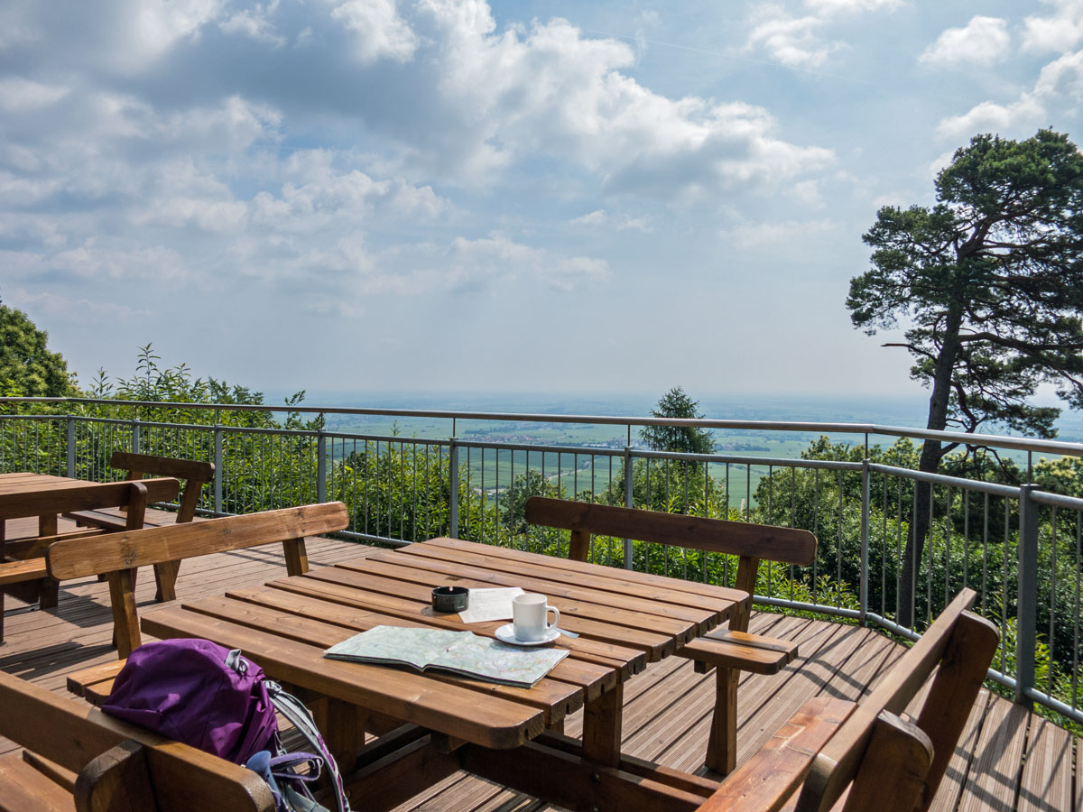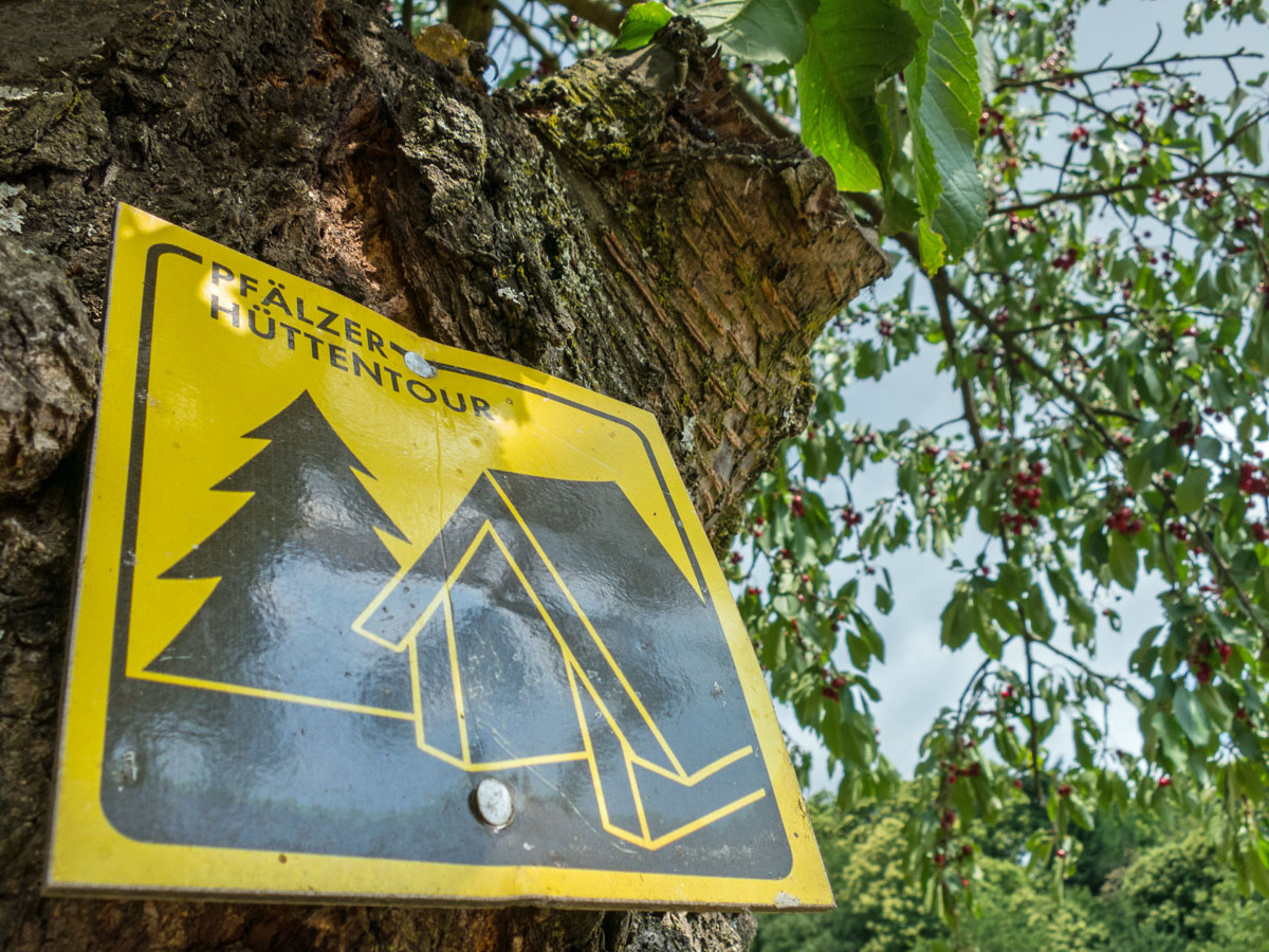 Durch die Sonne geht es vorbei an Kirschbäumen, die bereits saftige Früchte tragen und rechts der Blick in die Rheinebene. Irgendwann führt ein breiter Forstweg weiter hinauf, der schließlich in einen Pfad übergeht und mich bis zur Ringelsberghütte führt.