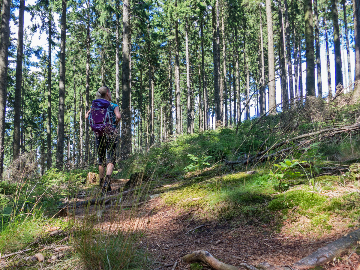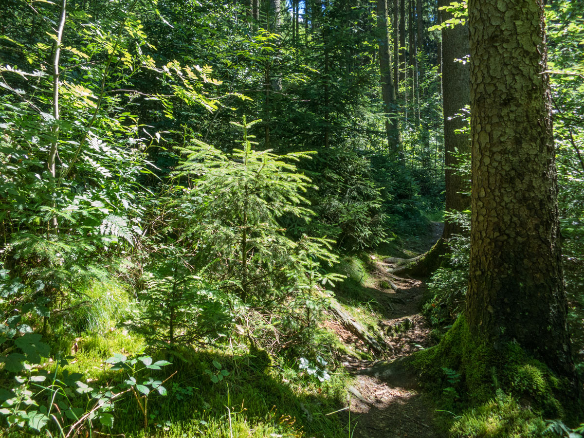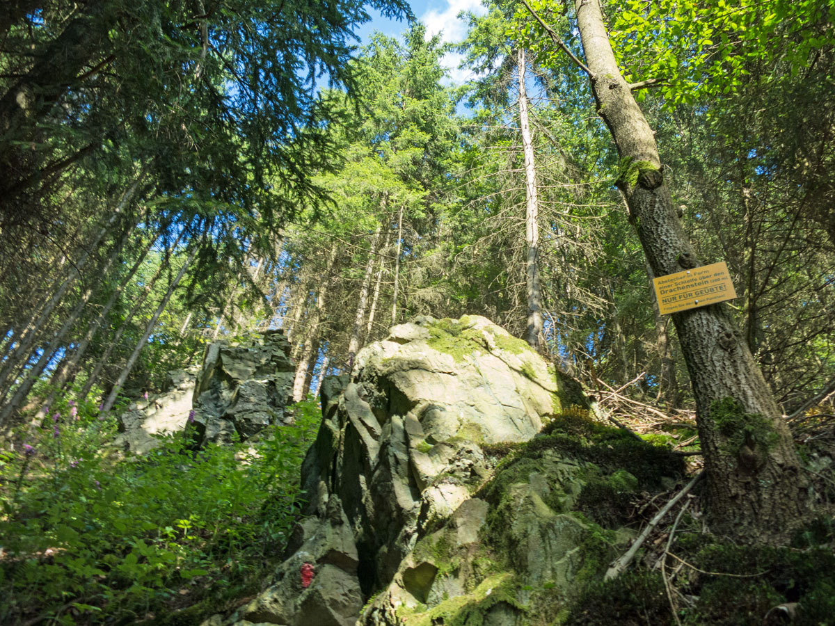 Ich genieße kurz die Weitsicht und gelange wieder in den Wald. Zwischen den Tannen finden sich hier einige Felsen, die an dem schmalen Pfad entlang bis zum Fredlar und dem höchsten Punkt der Tour führen.