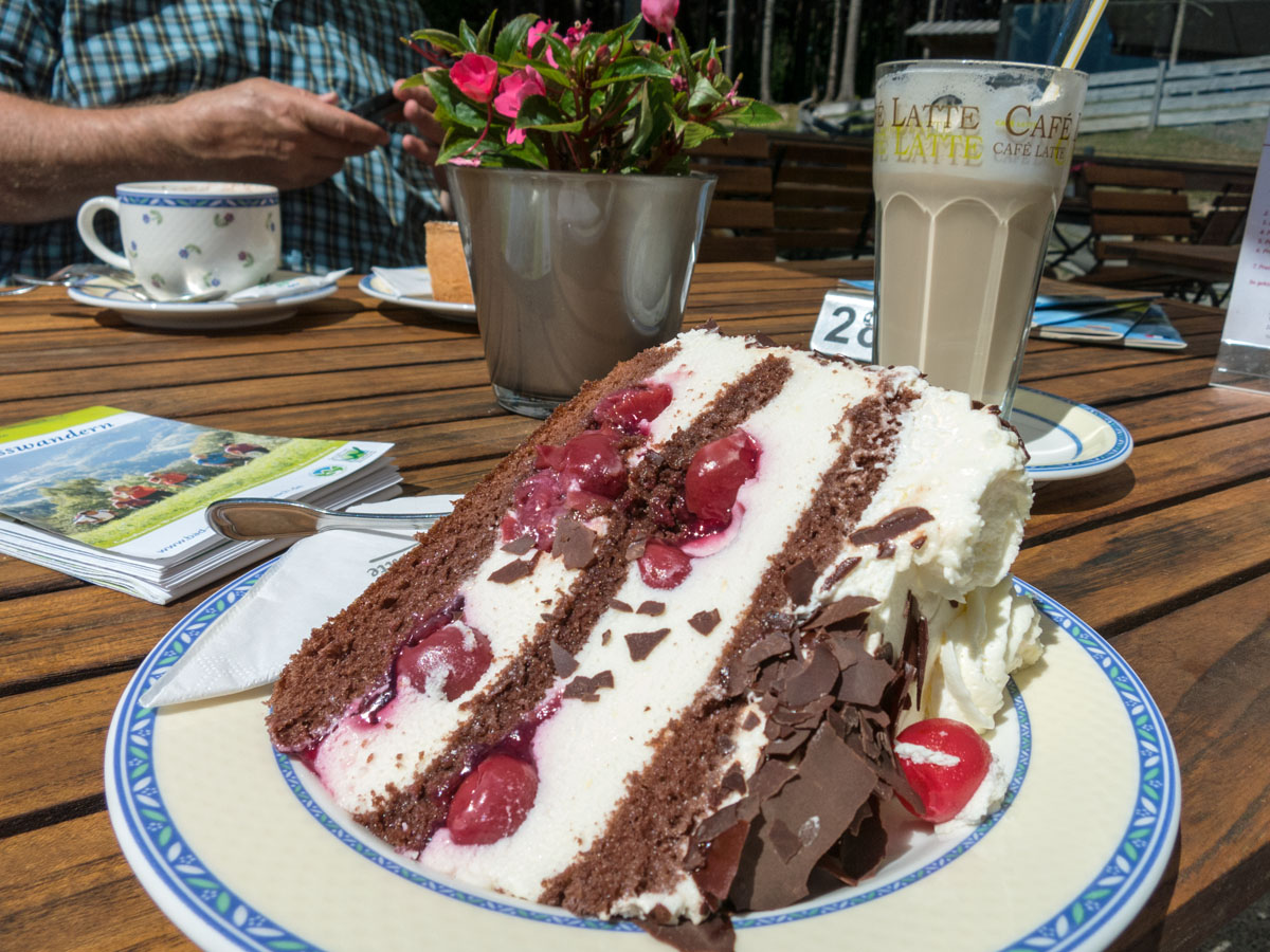 Es ist 11 Uhr, zu früh für ein Mittagessen, aber für ein zweites Frühstück mit Schwarzwälder Kirschtorte passt es. Von der Terrasse haben wir sogar einen Blick von oben auf den nächsten Abschnitt, der uns über die ersten Wiesen führen wird.