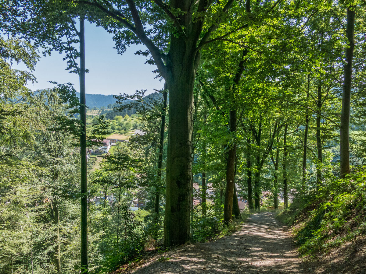 Nachdem dieser Abschnitt hinter mir liegt geht es auch schon an die ersten Höhenmeter durch den Wald. Pfade und Waldwege führen mich in Kehren hinauf und an einer Hütte bietet sich ein toller Blick auf Bad Peterstal.