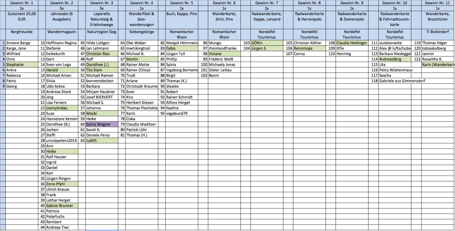 Herzlichen Glückwunsch an die 20 Gewinner (grün) und der Gewinnerin des Hauptpreises (lila) den 50,00 EUR Bergfreunde-Gutschein: