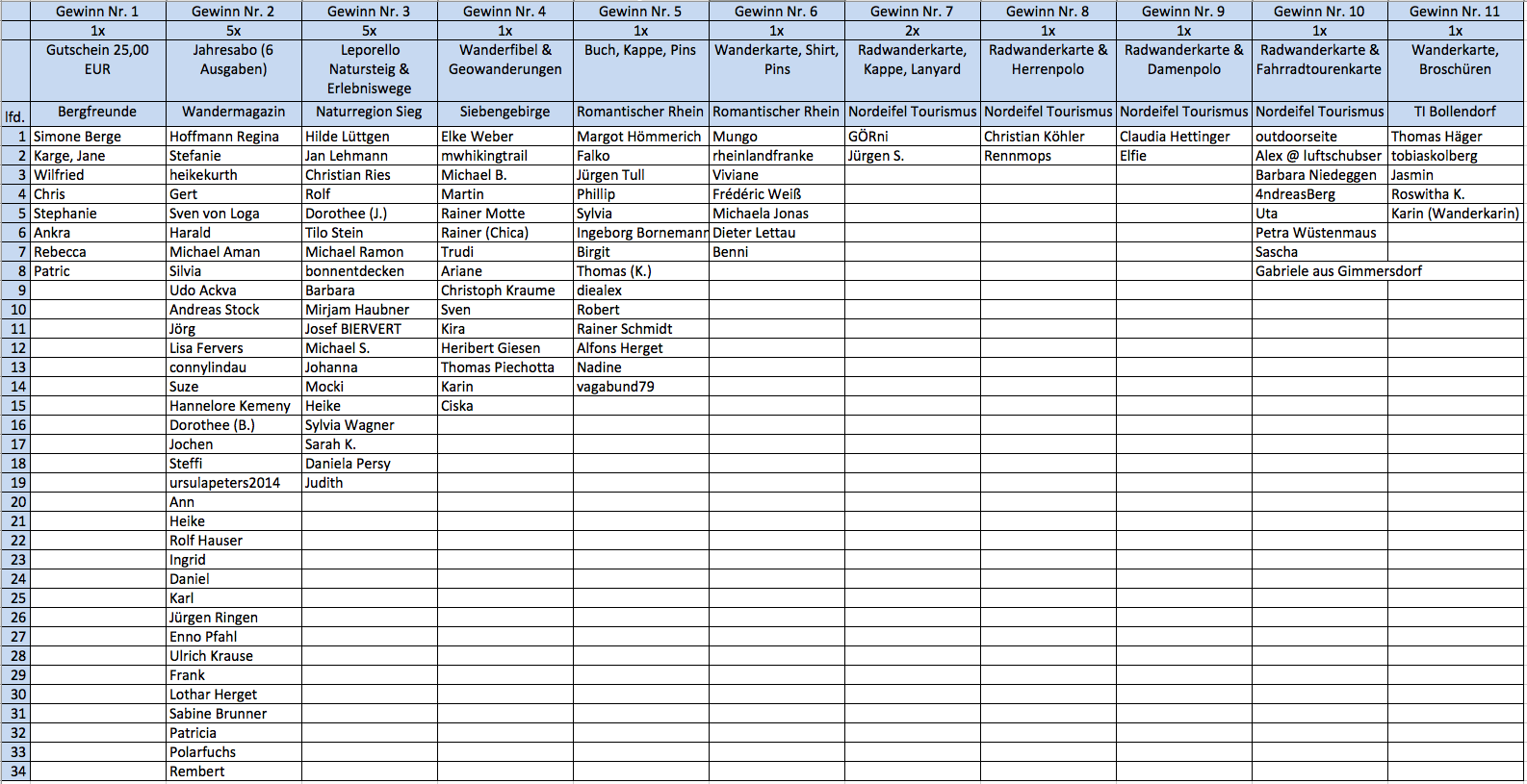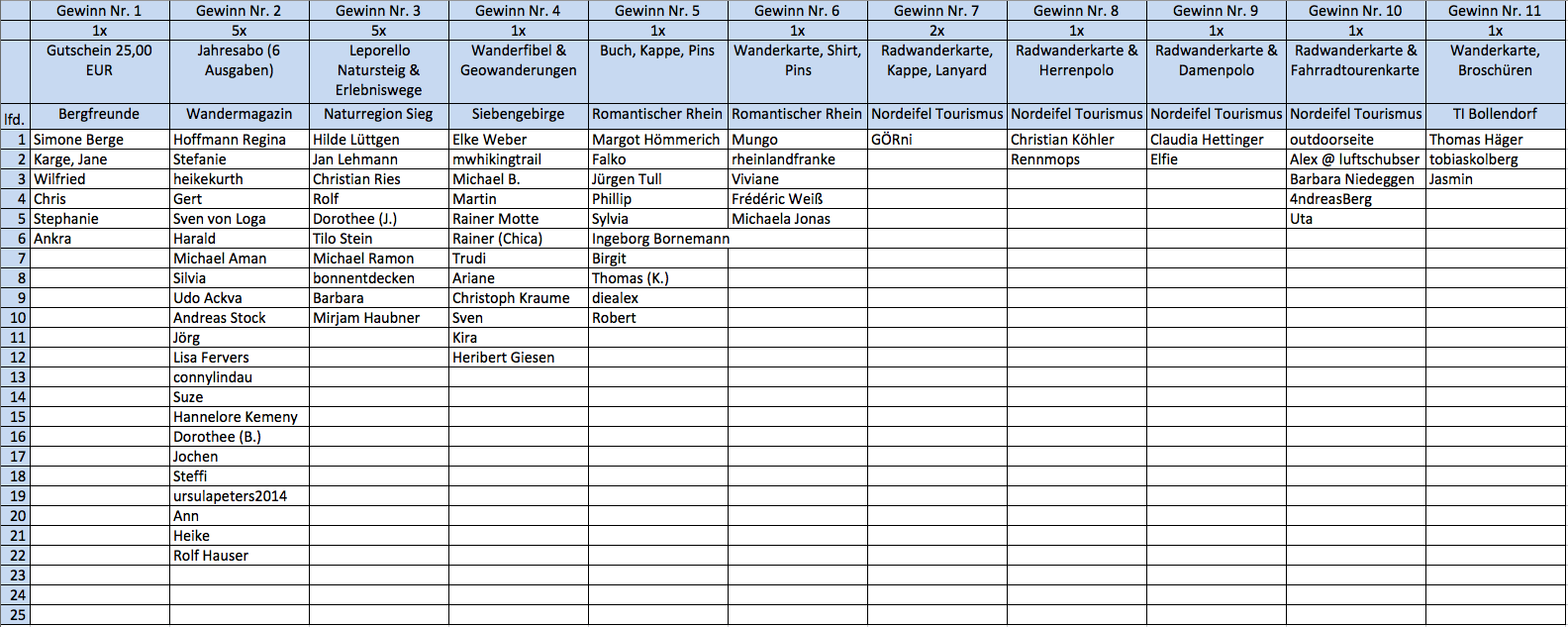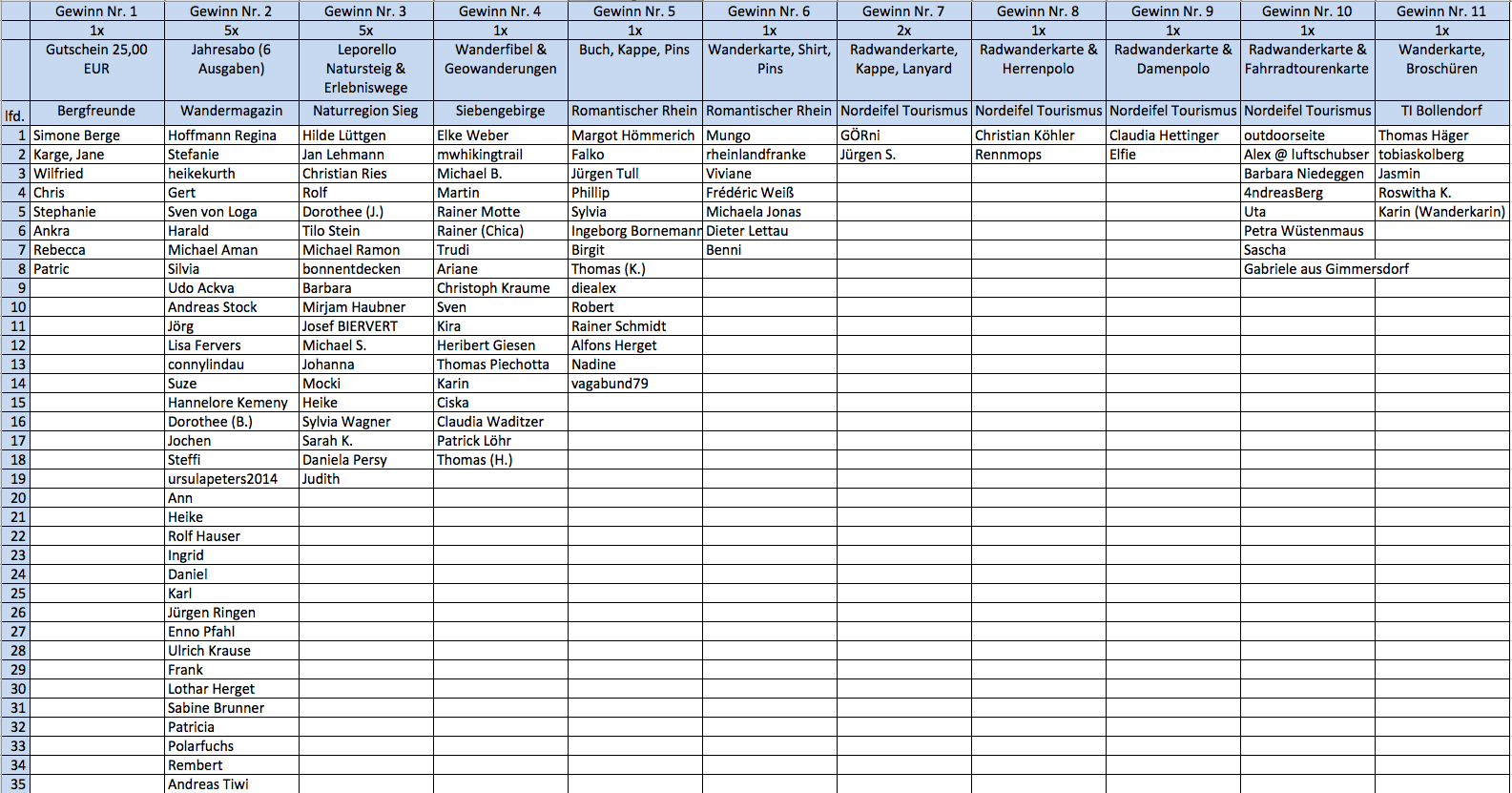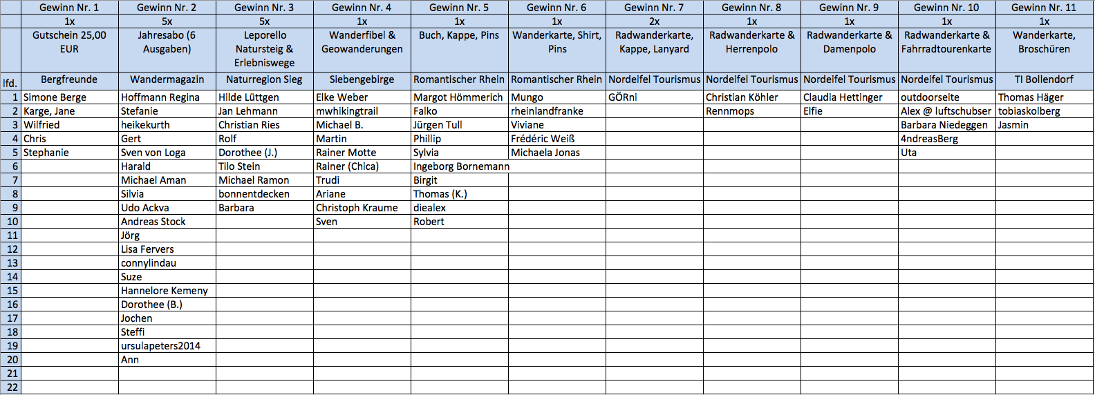 Die Gewinner wurden von mir per Mail informiert. Ich wünsche allen viel Spaß mit Ihren Wanderbüchern, Karten, den Abos und den Gutscheinen und weiterhin viel Freude da draußen 🙂