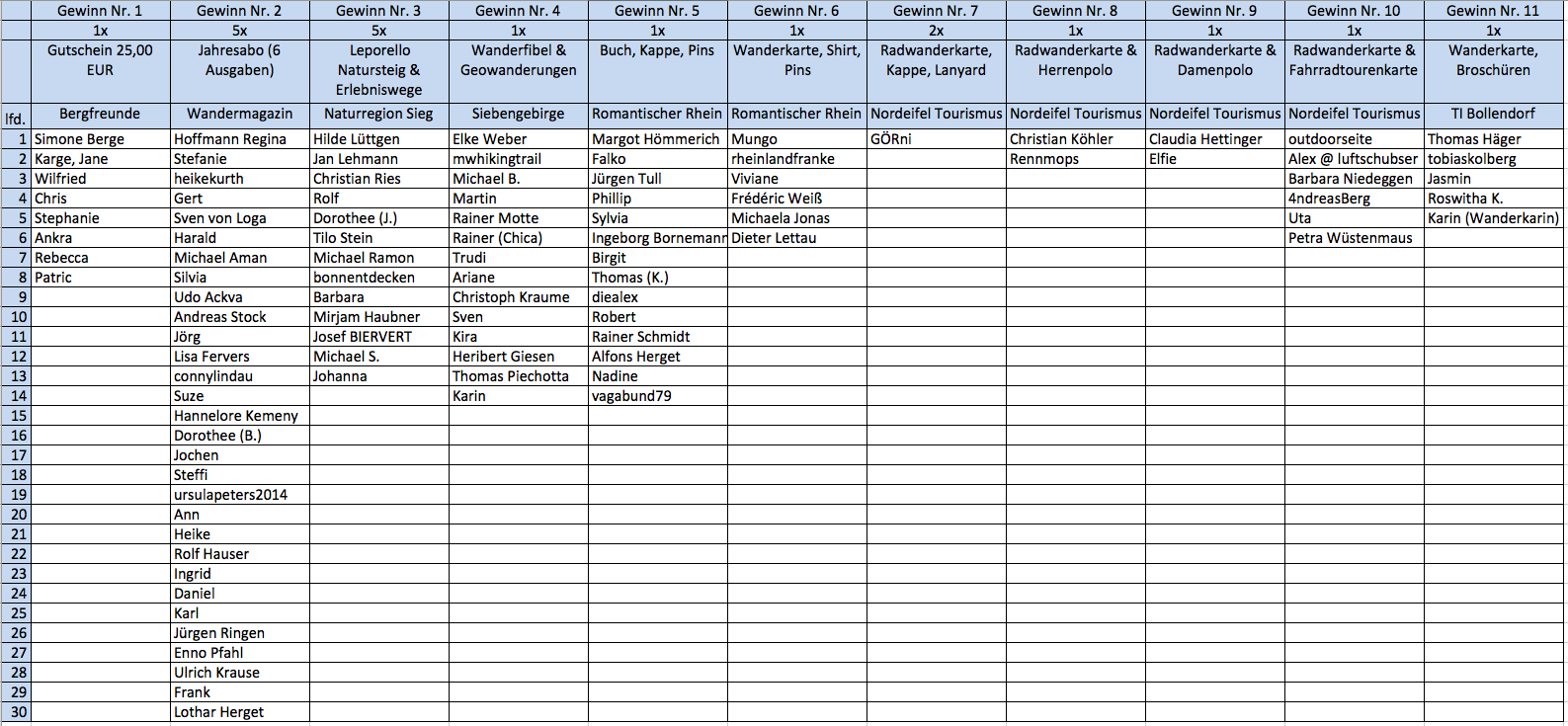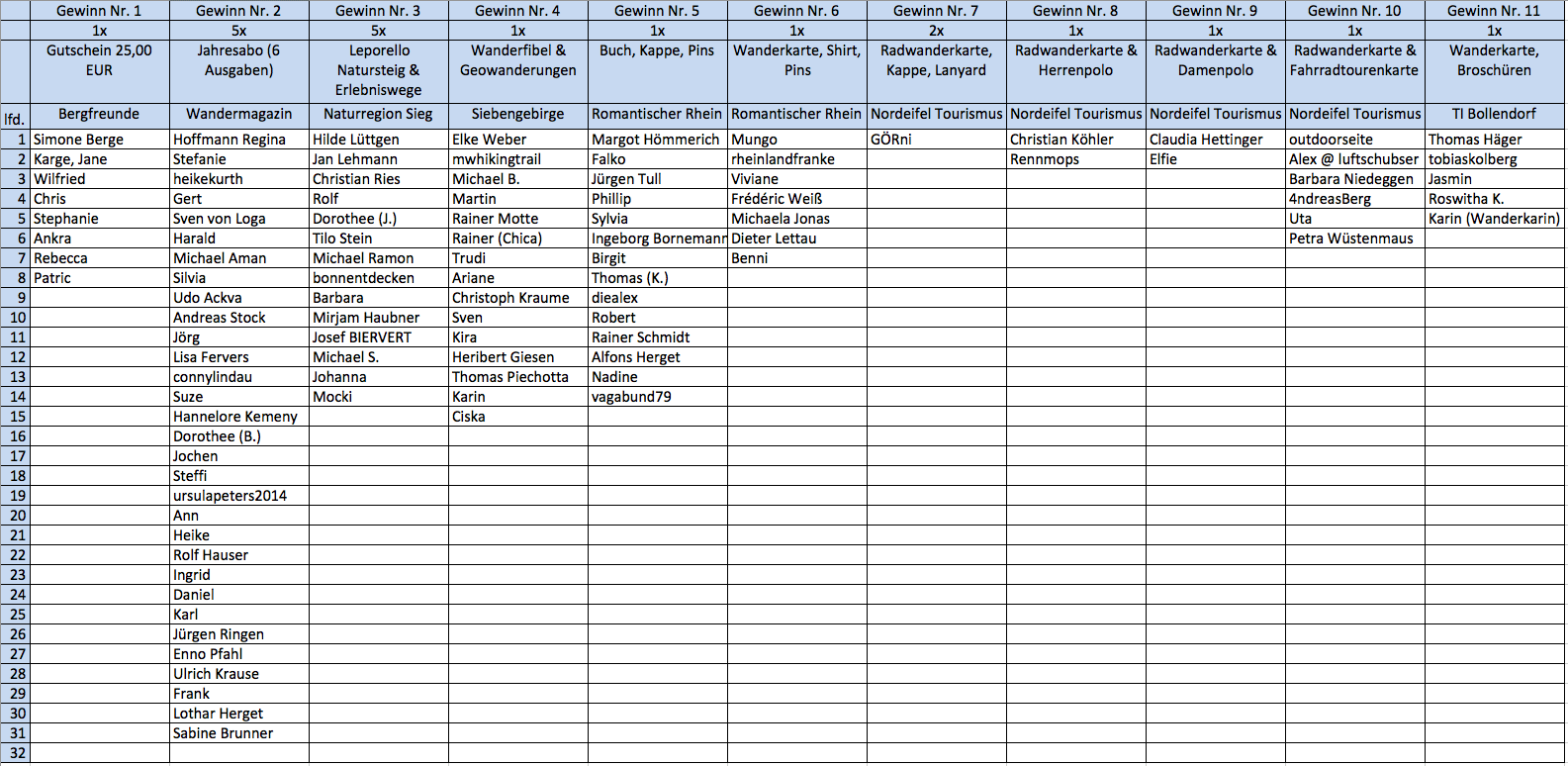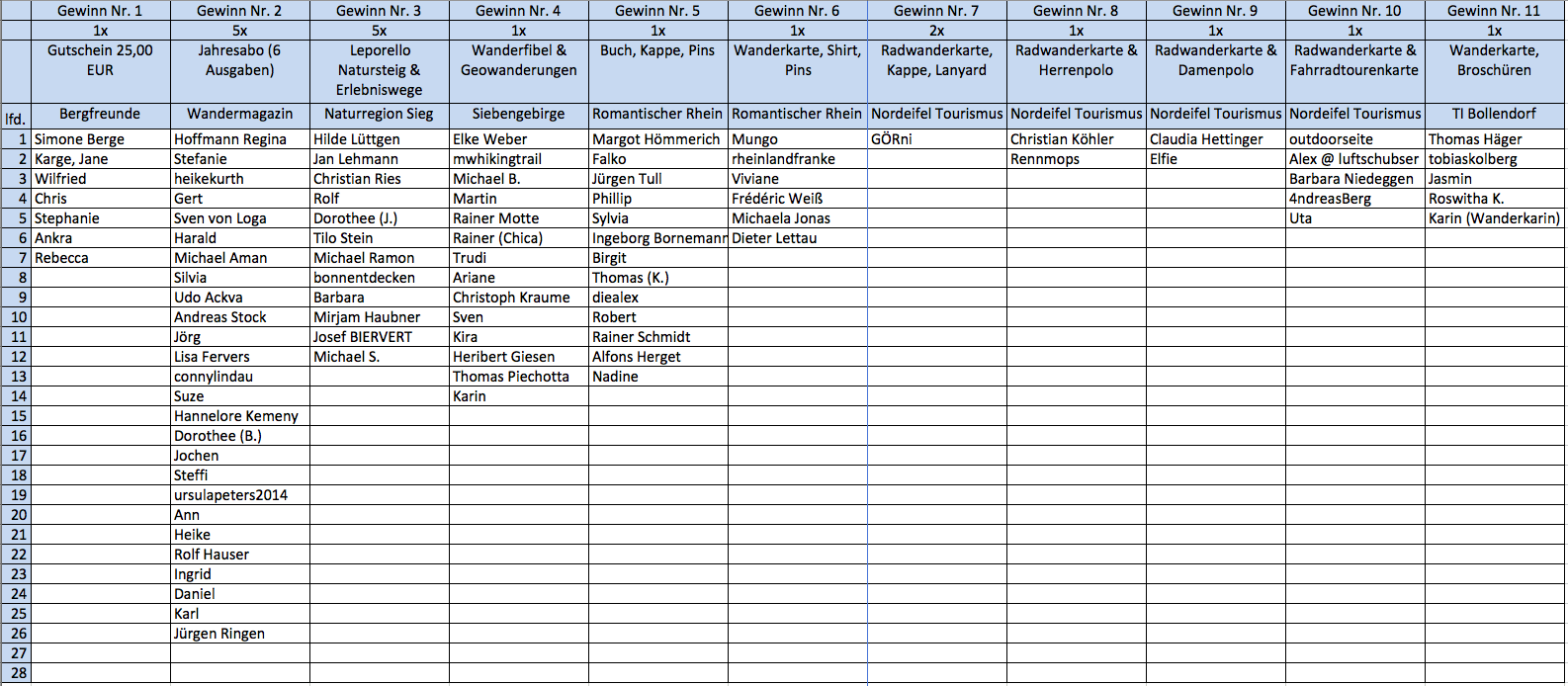 Die Gewinner wurden von mir per Mail informiert. Ich wünsche allen viel Spaß mit Ihren Wanderbüchern, Karten, den Abos und den Gutscheinen und weiterhin viel Freude da draußen 🙂