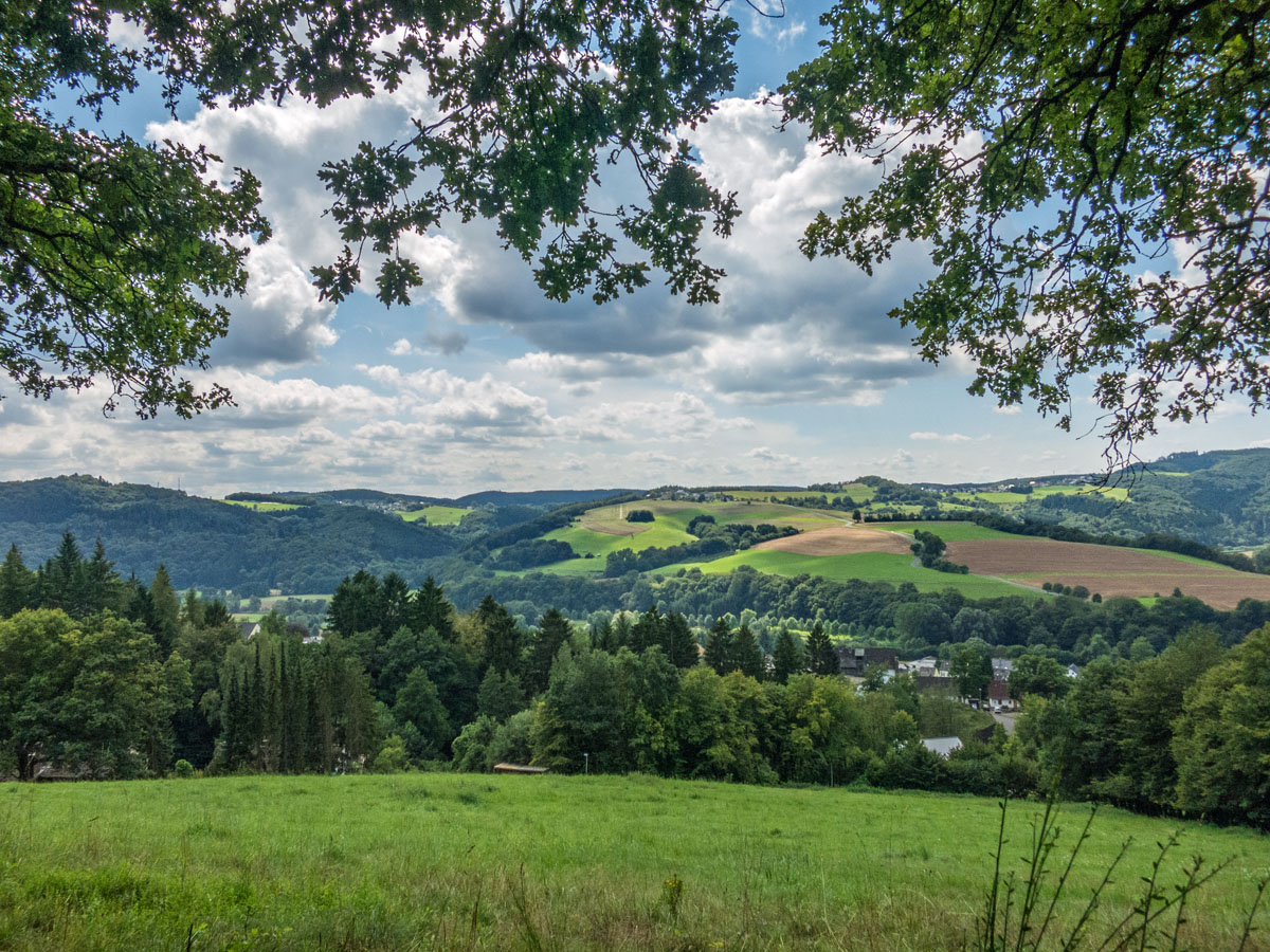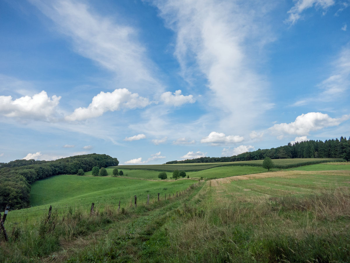 Dann wird es wieder pfadig und ich komme an einem Absprungplatz für Gleitschirmflieger vorbei. Der Westerwaldsteig bringt mich weiter in die Höhe und an Maisfeldern entlang darf ich dann wieder durch die offene Landschaft wandern.