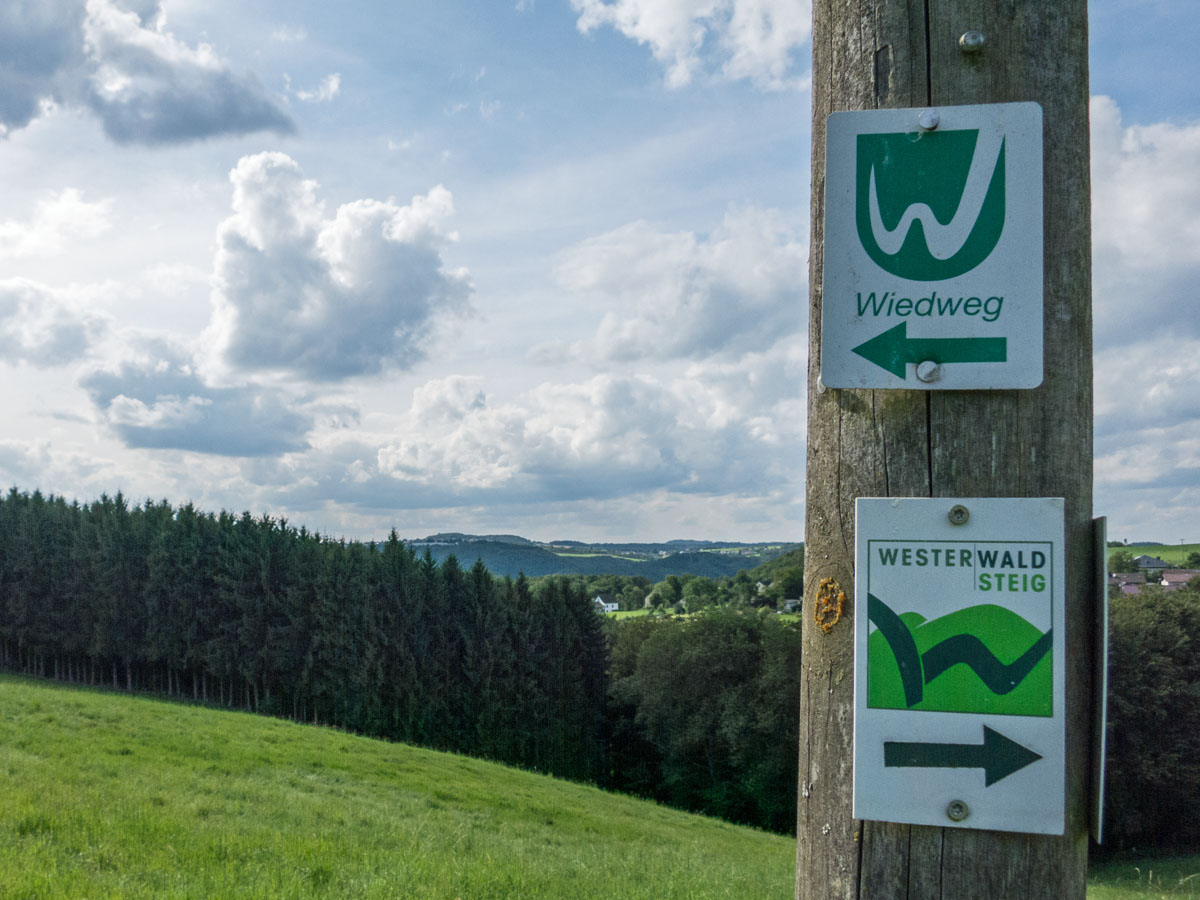 Beim Basaltbogen wird das Wegezeichen sogar nur einmal gewechselt und so führt dieser 12 km lange Rundweg sowohl über den Westerwaldsteig als auch über den Wiedweg.