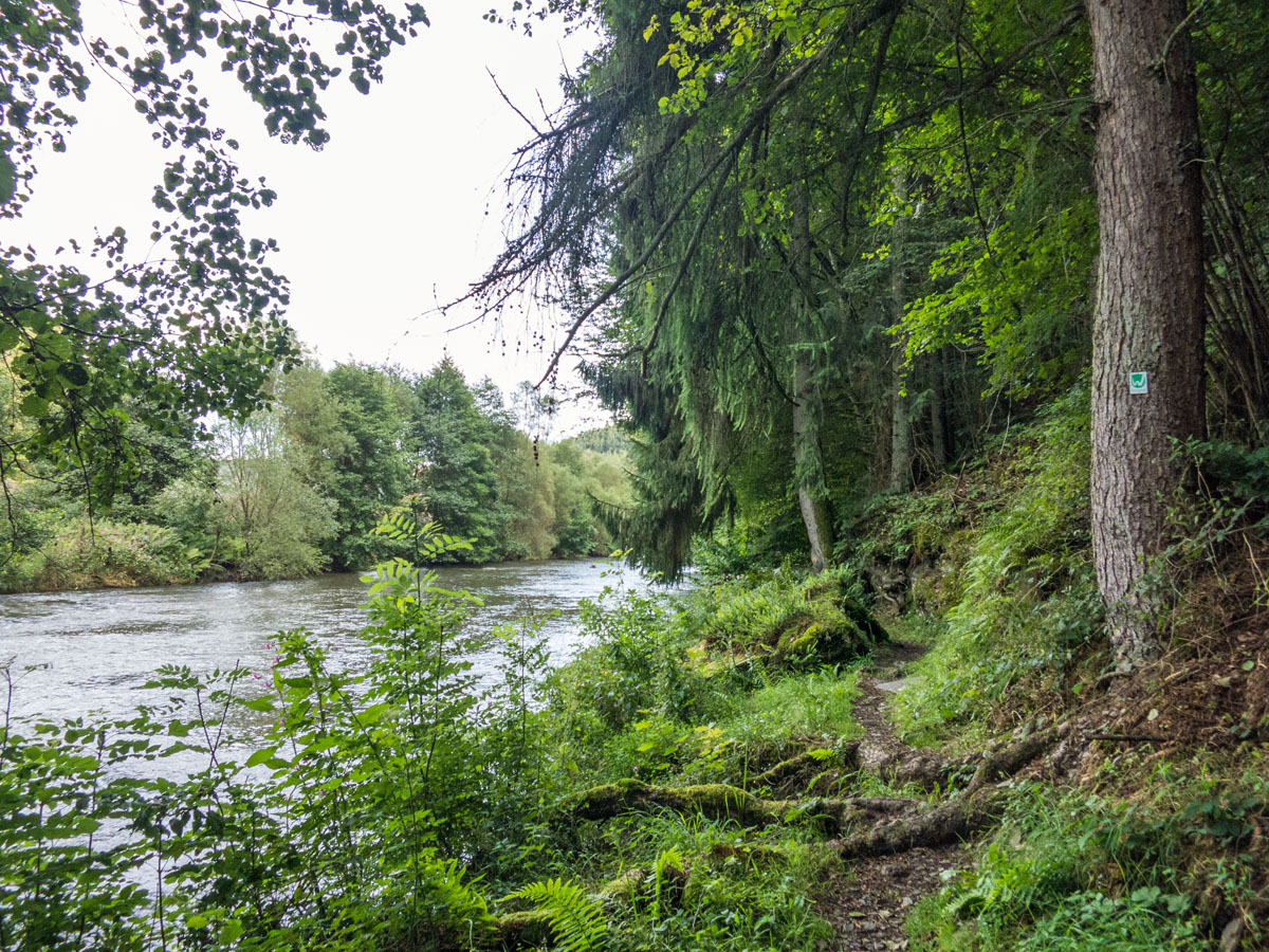 Der Pfad ist echt schnuckelig, zum Teil mit Wurzeln durchsetzt und führt mich an Felsen entlang parallel zur Wied.