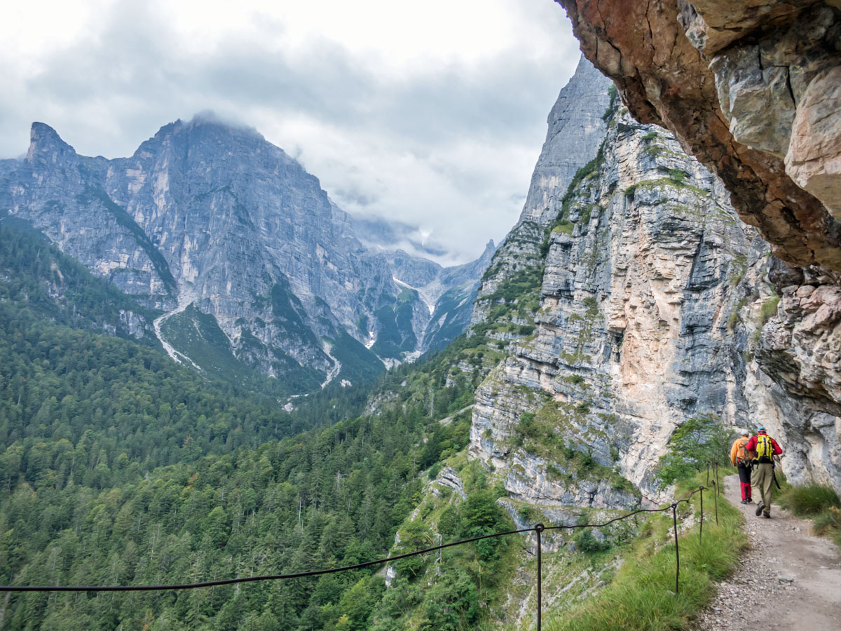 IMG_3346Am Rifugio Croz del’Altissimo machten wir eine kurze Pause um dann den zum Teil ausgesetzten Anstieg zum Rifugio Silvata anzutreten. Die Wolken wurden dunkler und es fing an zu regnen. Also schlüpfte jeder in seine Regenjacke und eine bunte Truppe machte sich weiter auf.