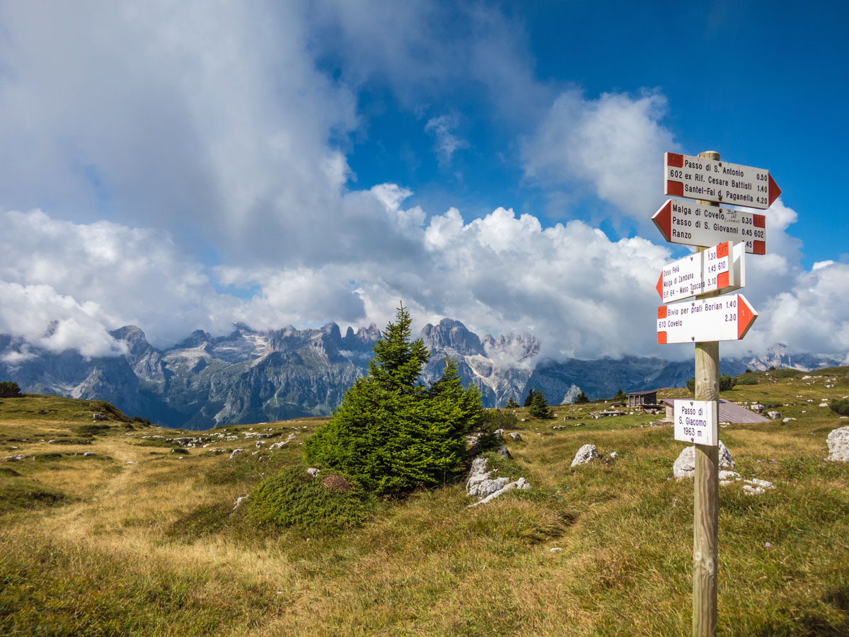 Am Passo di S. Giacomo folgten wir der 610, die uns wieder in eine andere Welt führte. Hütten und Kühe auf den Wiesen, Wanderer, die in der Sonne lagen und immer wieder dieser gigantische Blick auf die Brentas.