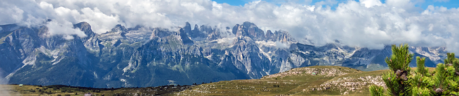 Peter Schlickenrieder, mit dem ich letztes Jahr noch auf dem Croz del’Altissimo stand, war ebenfalls mit dabei und dieses Mal begleitete uns auch seine Frau Andrea, so dass die Truppe mit Bergführer und Eventfotograf aus insgesamt 8 Teilnehmern bestand. Ziel der Tour war das Refugio Pedrotti. Zunächst ging es mit der neuen Bahn hinauf bis zum Rifugio la Montanara, von wo man einen genialen Blick auf die Brentas hat.