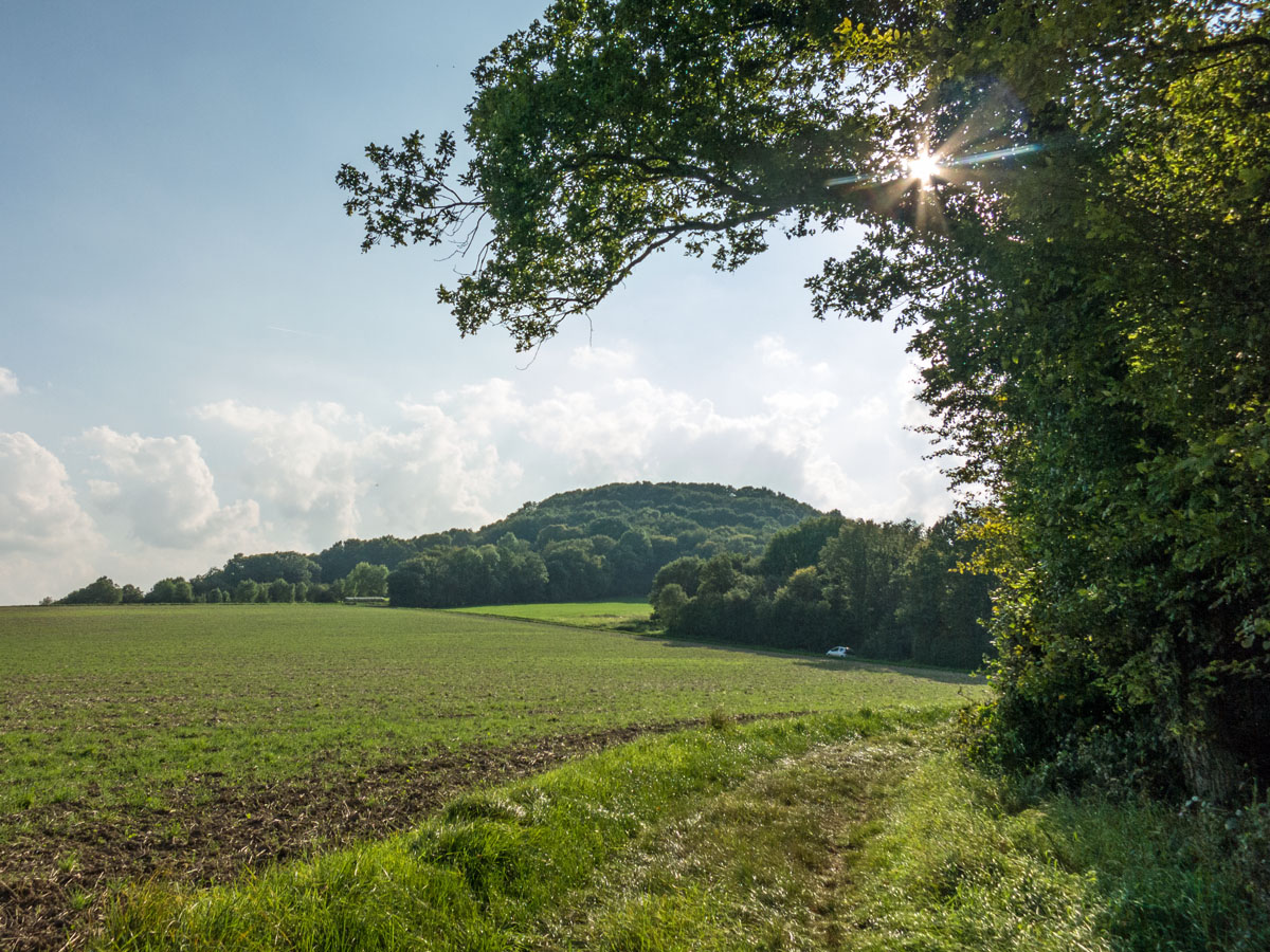 Dort biege ich ab, marschiere über die Wiese um am Waldrand dem Wanderweg 3 durch den Wald zu folgen, der mich oberhalb an den Feldern rausbringt.